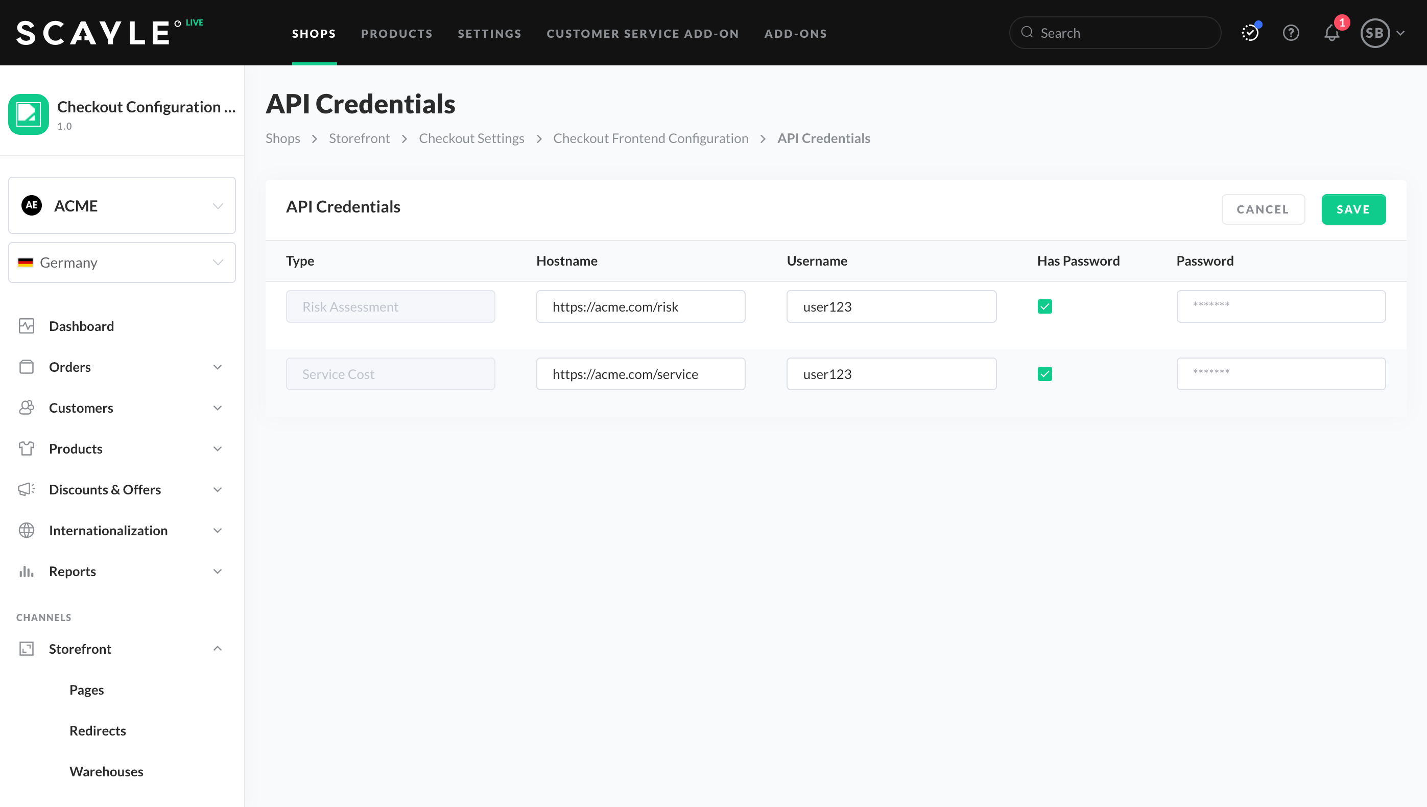 - To configure the credentials for the Risk Assessment, Address Validation and Service Costs endpoints, edit Hostname, Username, Has Password, and Password fields.