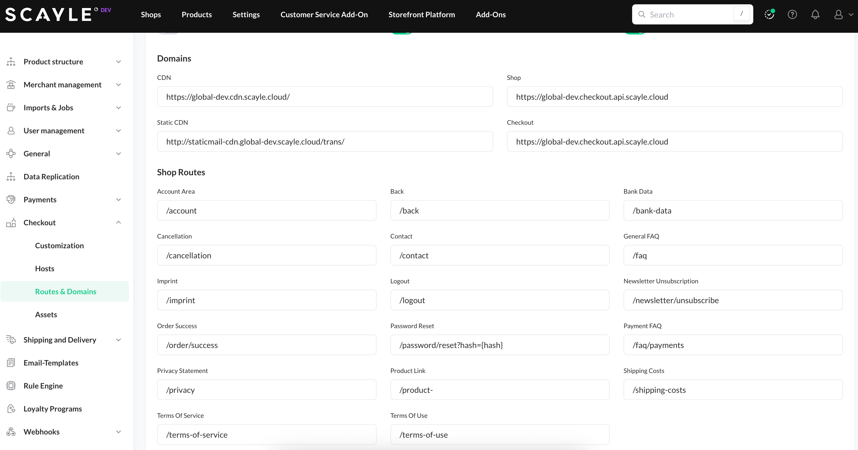 The necessary Routes & Domains configuration, specifically the Shop domain and Order Success Page route, can be conveniently adjusted within the SCAYLE Panel.