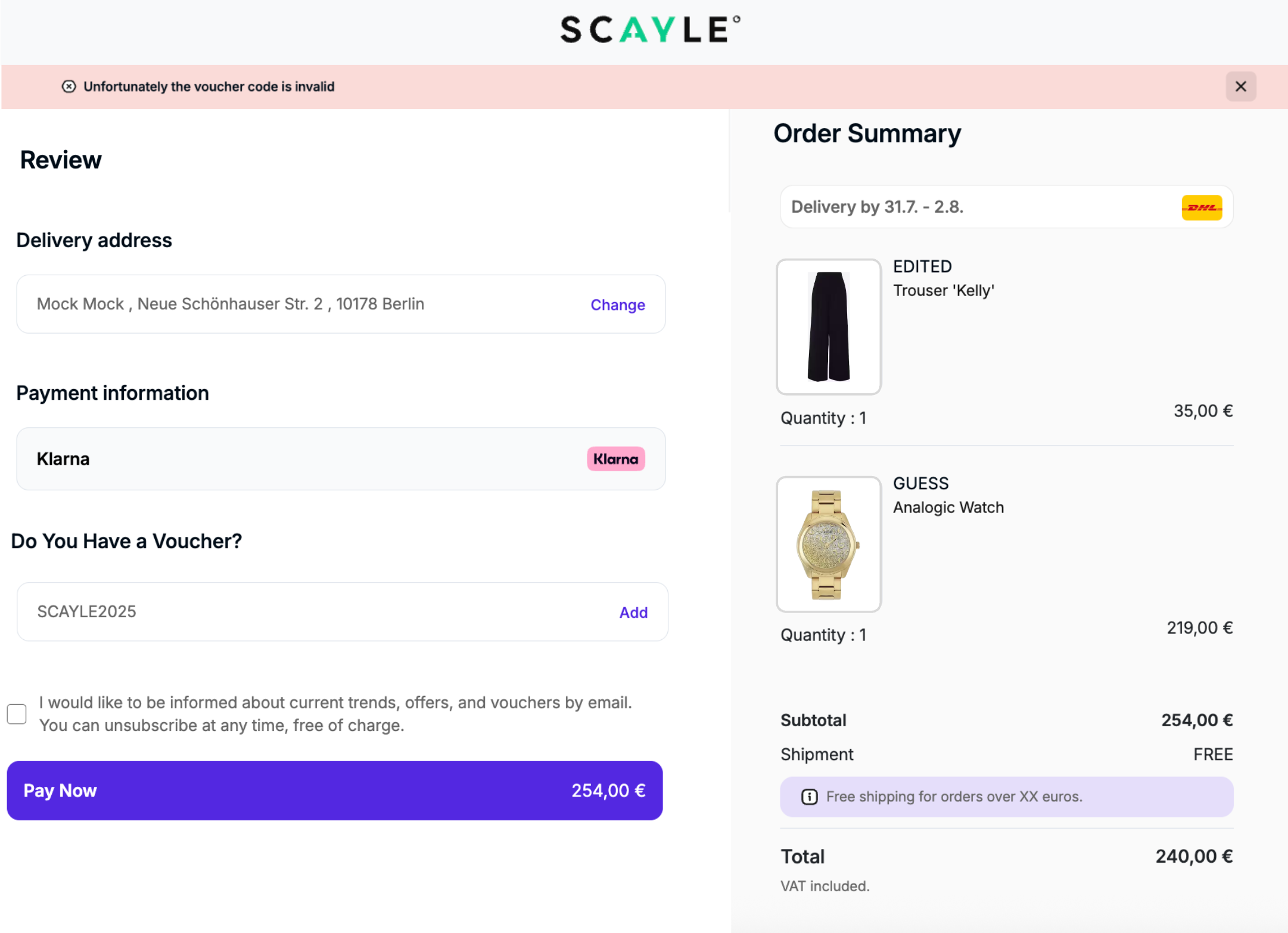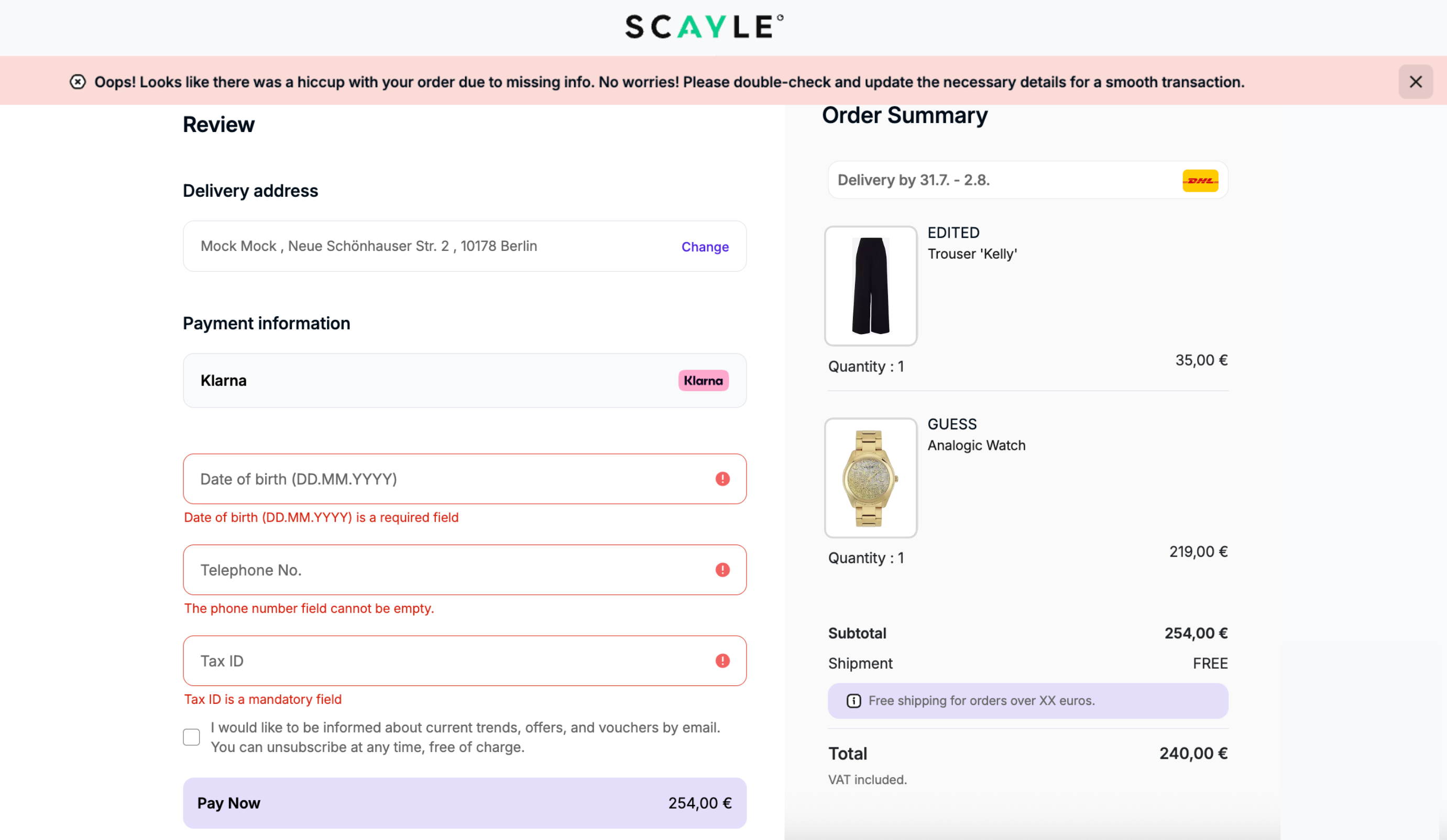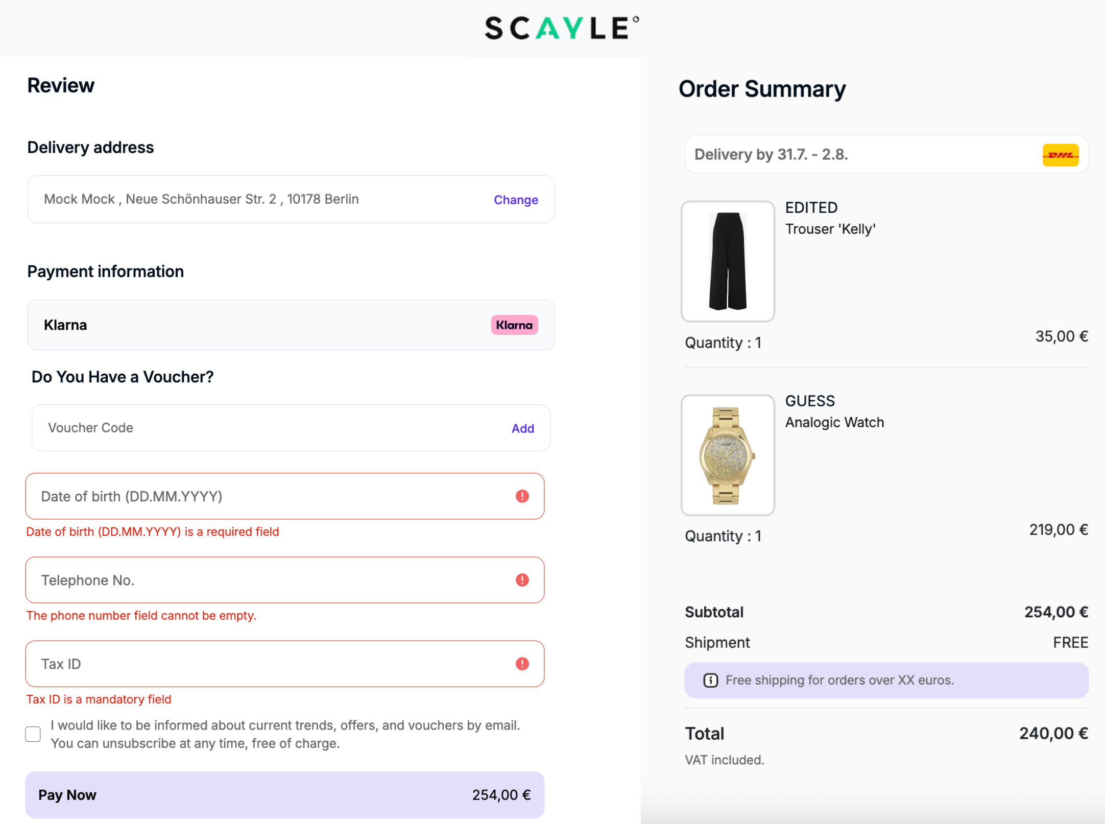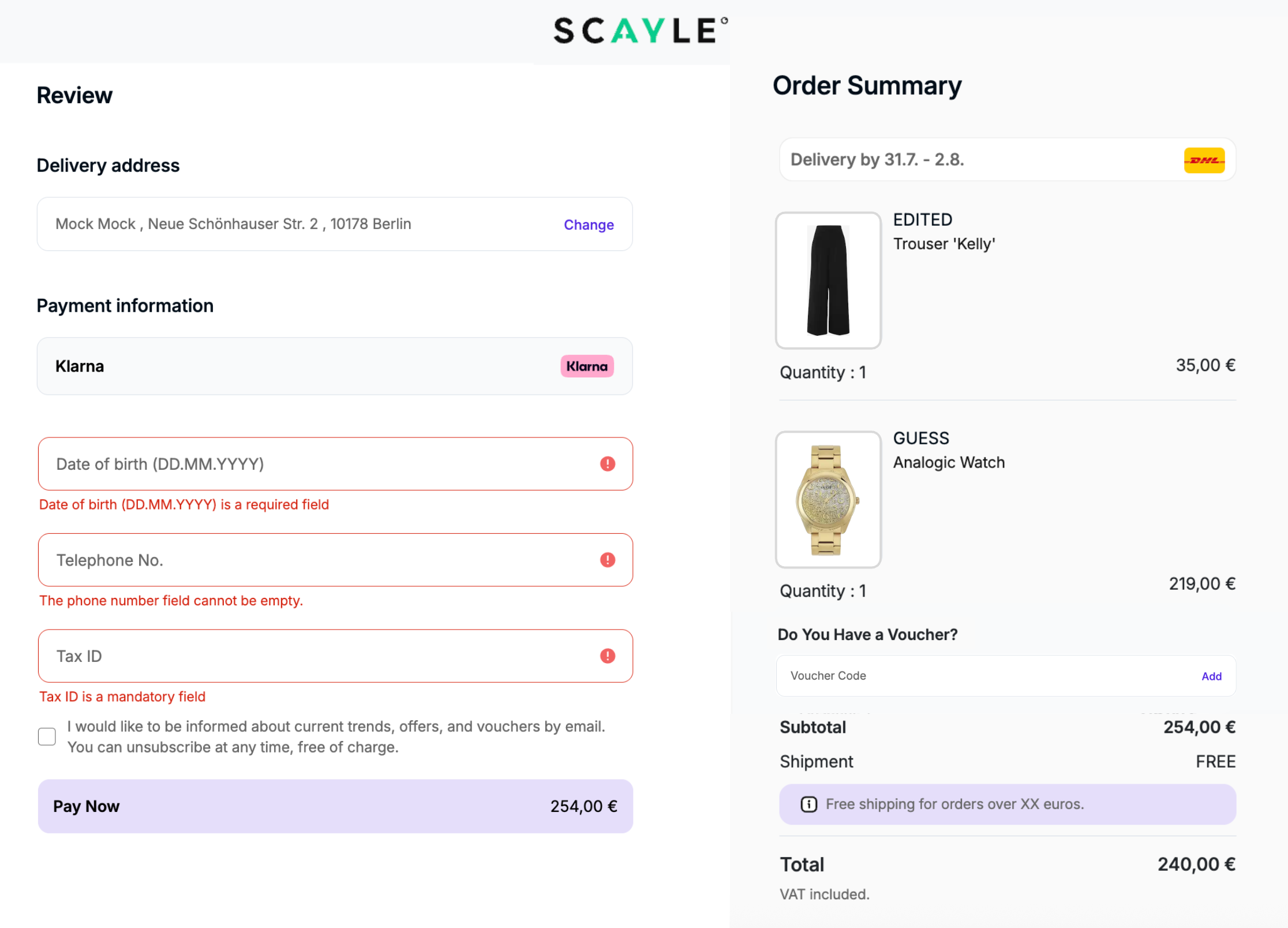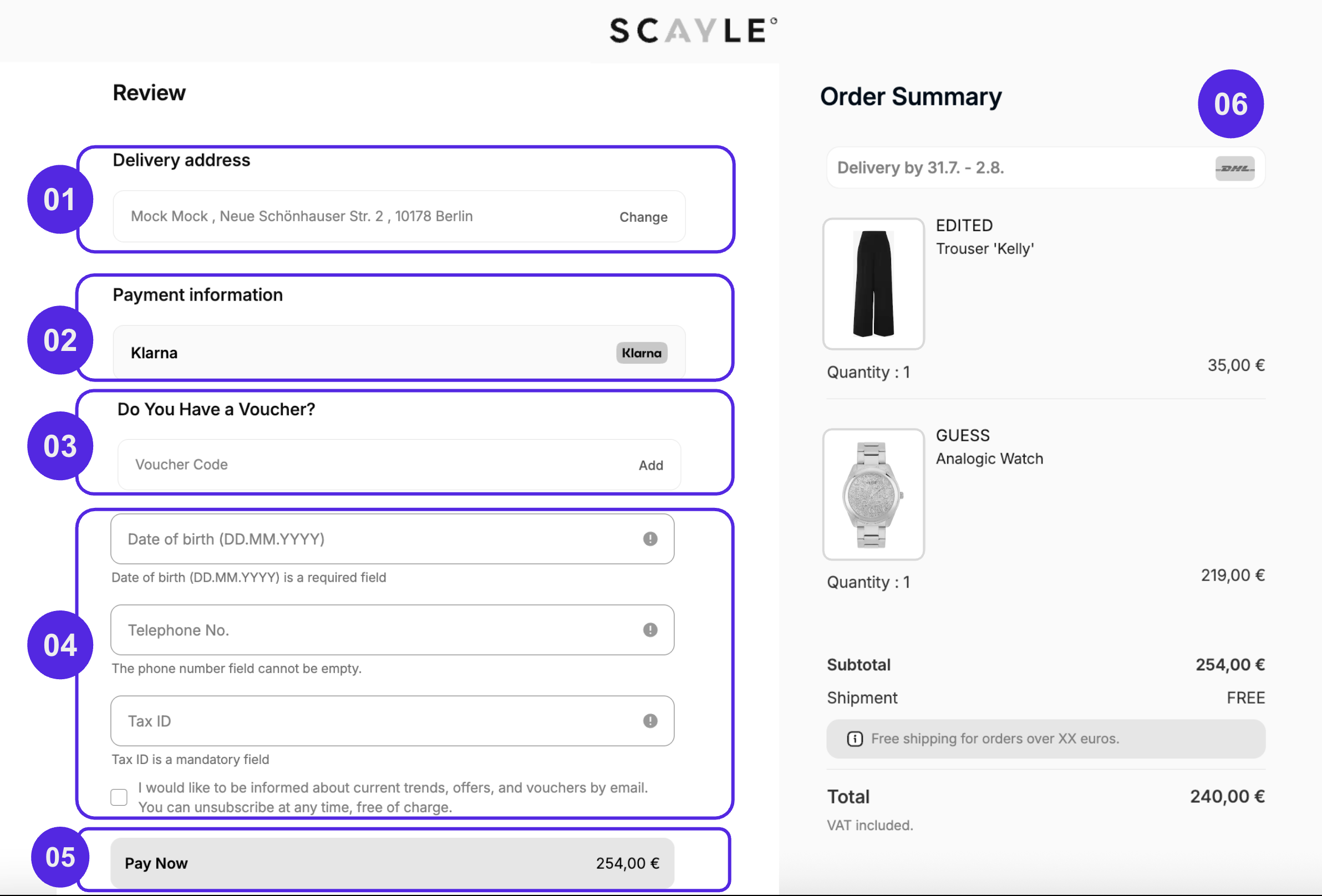 | 04 | Dynamic Fields | Configurable (mandatory/optional) | The Order Review Page will always display all enabled dynamic fields configured in the SCAYLE Panel for the shop. If a field is set as mandatory, the information must be filled in before confirming the order. |
