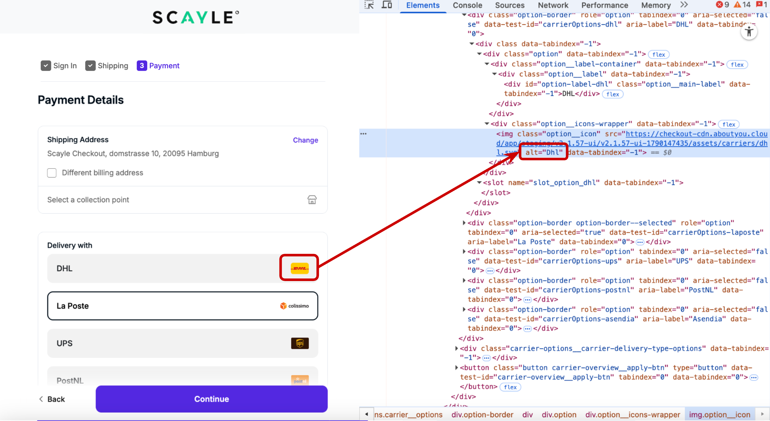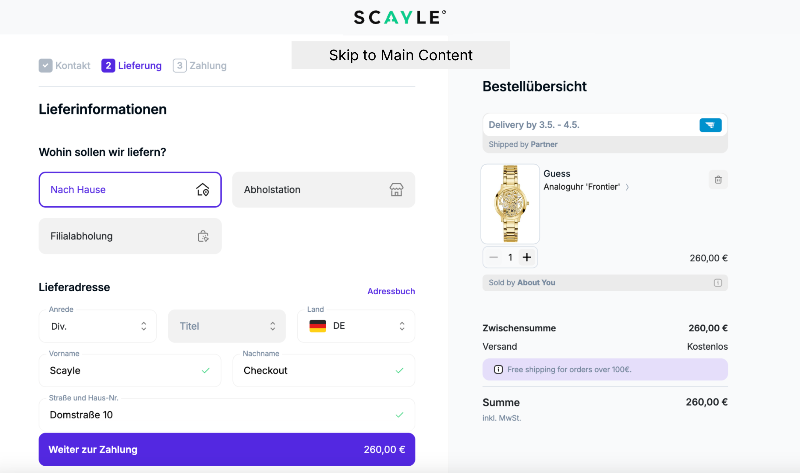 To prevent this, you can either remove the skip link from the checkout page, or adjust it to direct the user to the scayle-checkout element. Here is an example on how to adjust it: