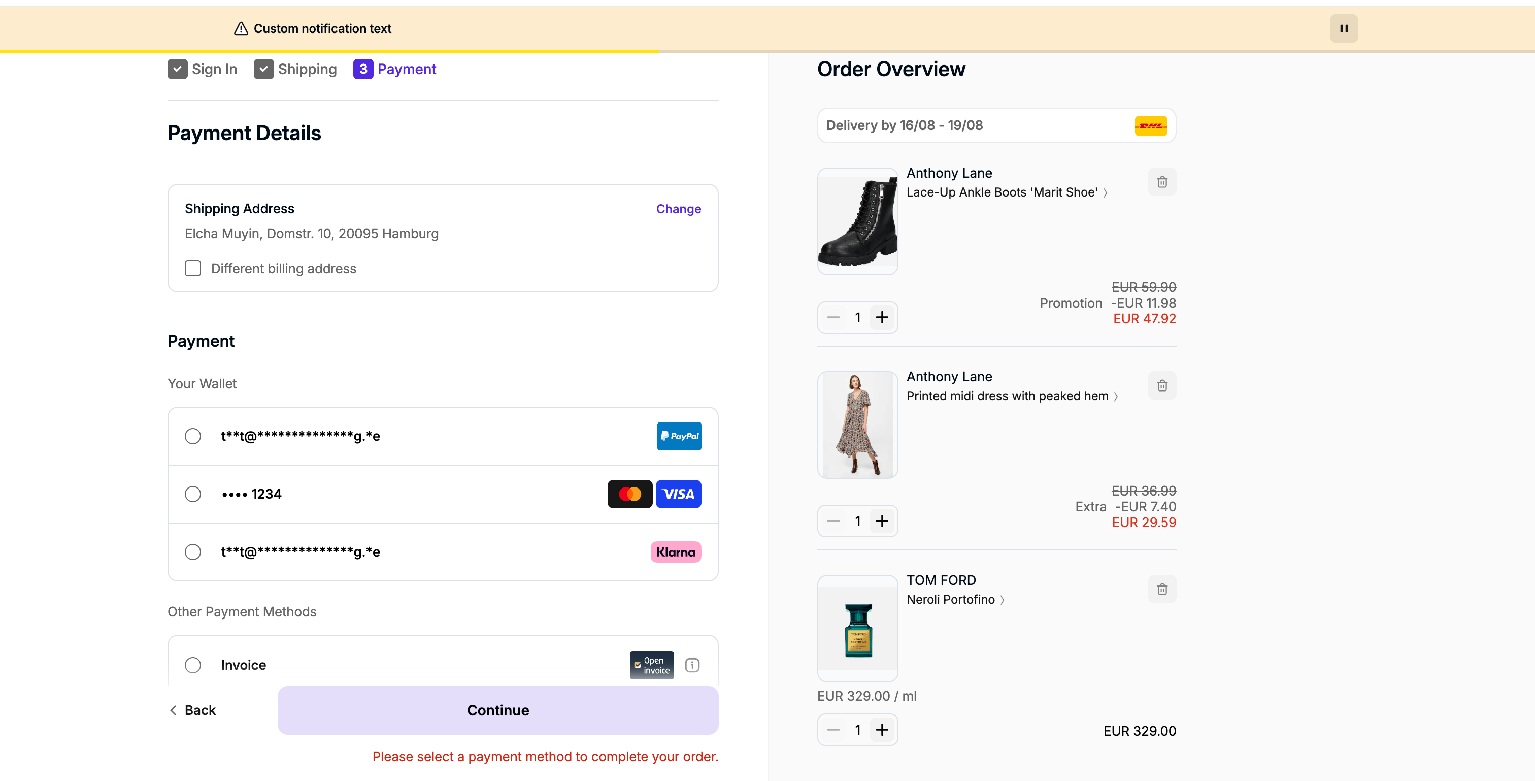 You can configure this in the SCAYLE Panel under Settings ➜ Checkout ➜ Customization ➜ General Settings ➜ Notifications.