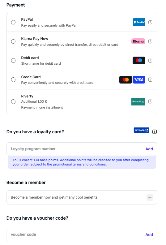 If you want to configure loyalty point redemption, please note that it is only supported with specific payment providers. The following methods allow partial payments with loyalty points: