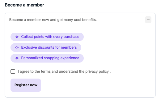 First-time users can register for a loyalty or membership program directly within the checkout flow using a dedicated registration form. Once completed, the newly registered loyalty account is linked to the order.