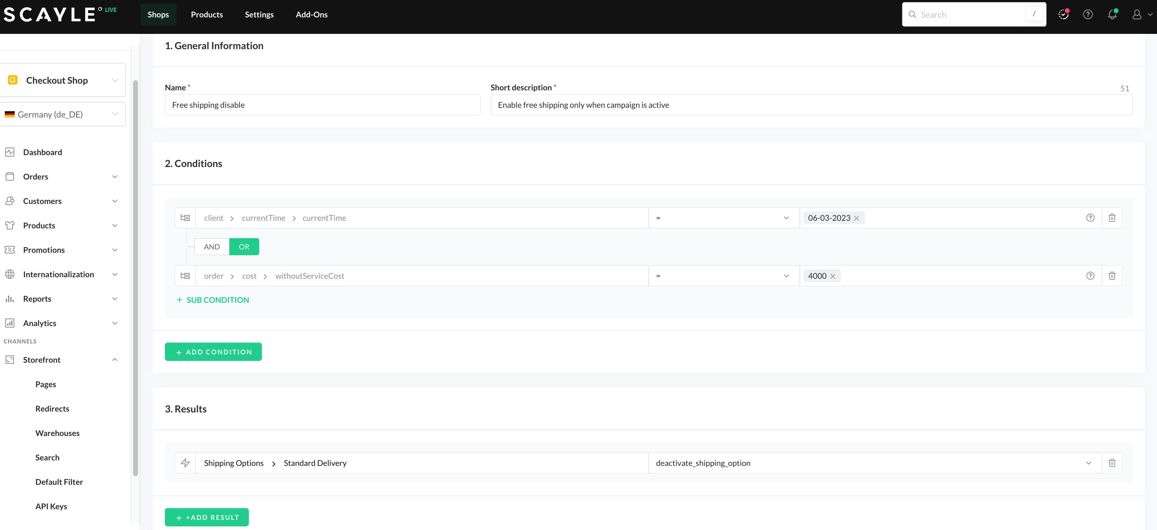 Scenario: Set free shipping for all women living in Berlin or Hamburg for orders from the 7th of March until the 9th of March.