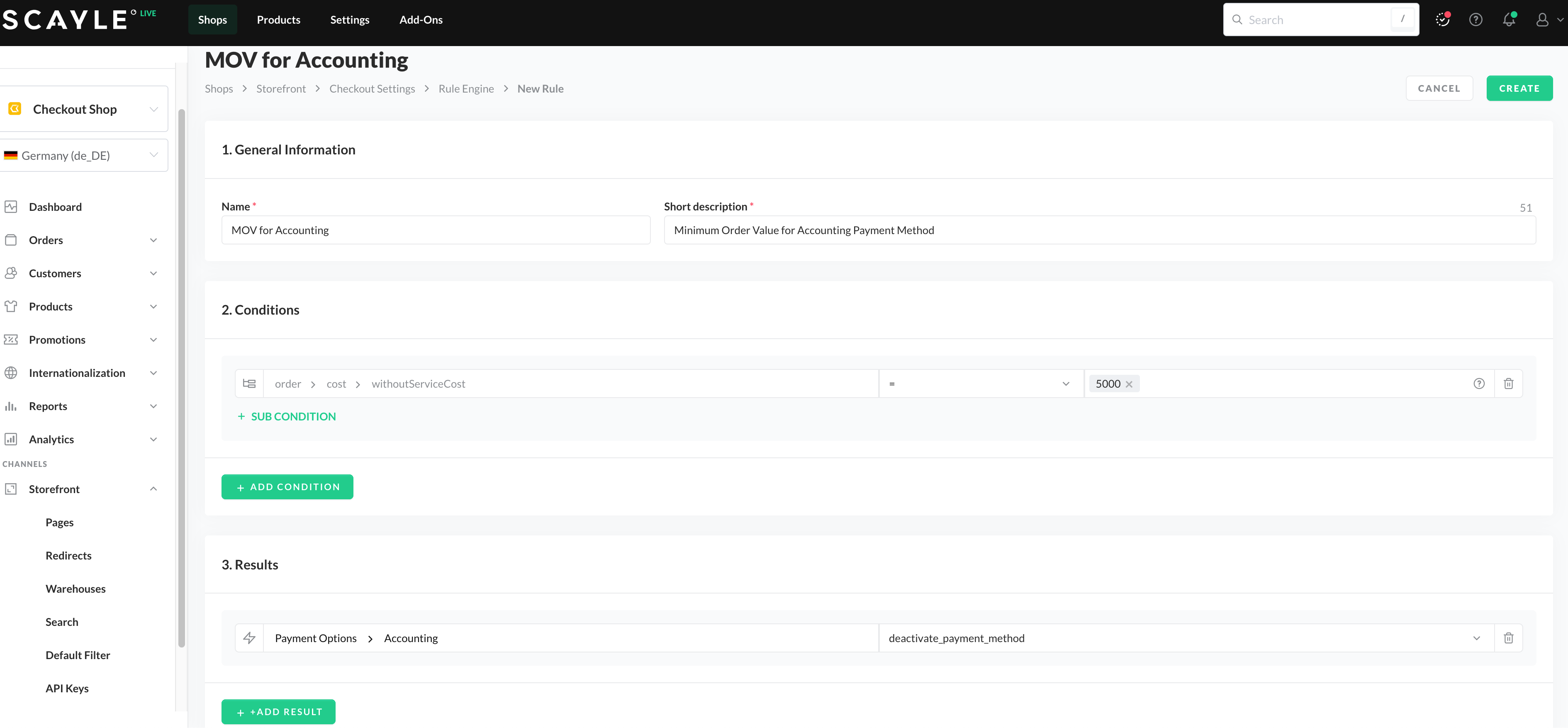 A rule can be set for payment methods requiring a minimum order value (MOV). For example, you may want to disable the Accounting (B2B) payment method for orders less than a threshold. If MOV is not reached, the payment method is deactivated (does not appear in checkout).