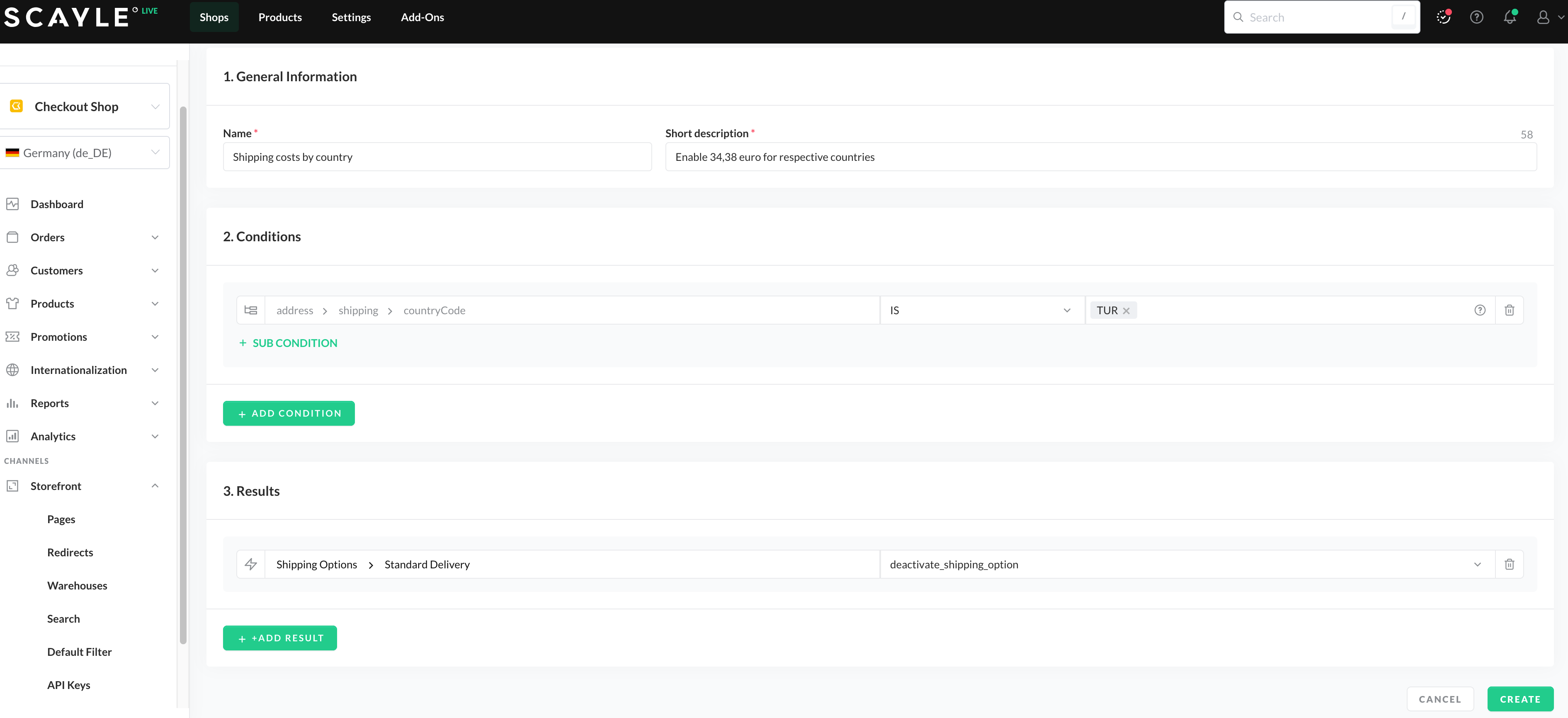 A rule can be set to enable/disable specific shipping costs for a given shipping country (global or EU shop). For example, you can create a rule where, if a customer selects a shipping country, all shipping options are disabled that do not have a specific cost.