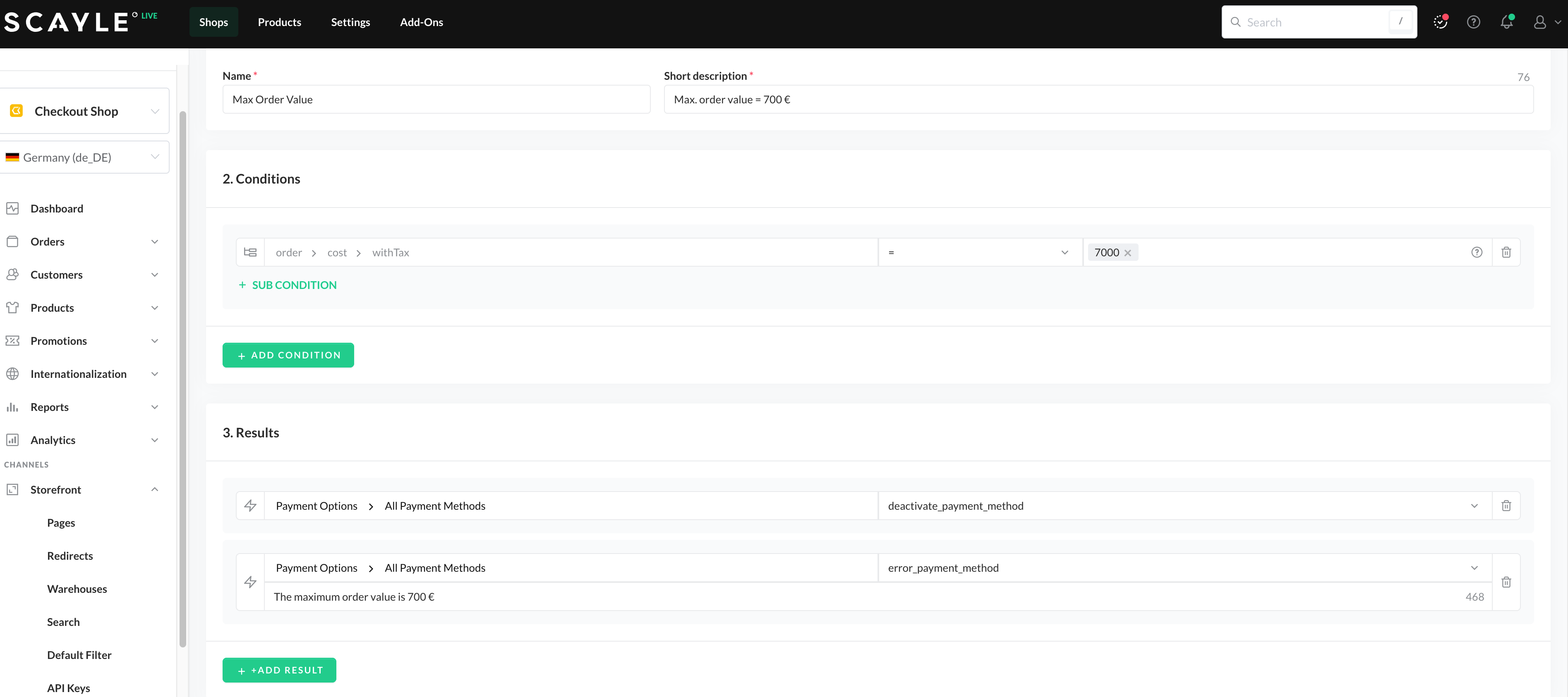 Below is a sample rule set for an order with a max value of 700 €. All payment methods will be deactivated if the customer orders items that cost higher than 700 €.