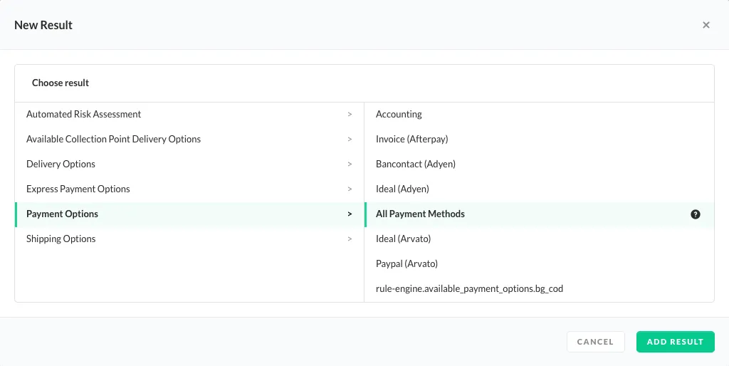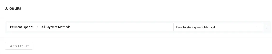 - Results: Select one or more results to trigger if the conditions are met (e.g., Payment Options ➜ All Payment Methods ➜ Deactivate Payment Method).