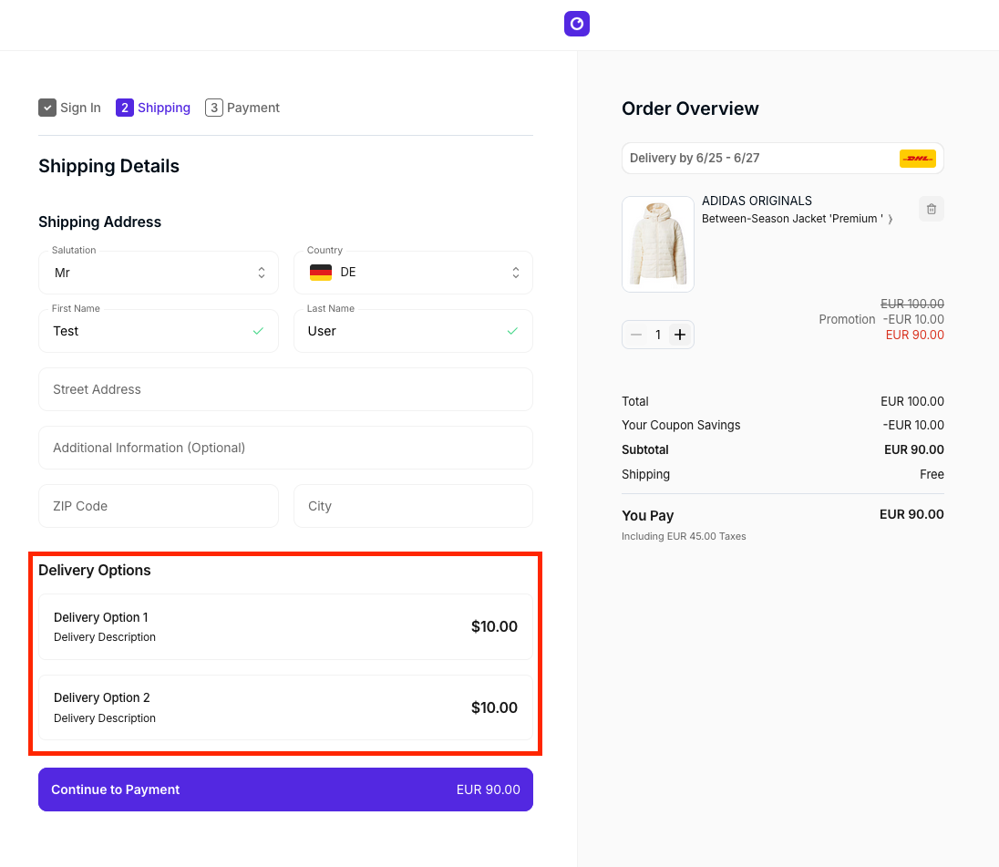 In this example, we place the component directly below the shipping address using the slot_dynamic_area_shipping_address slot.