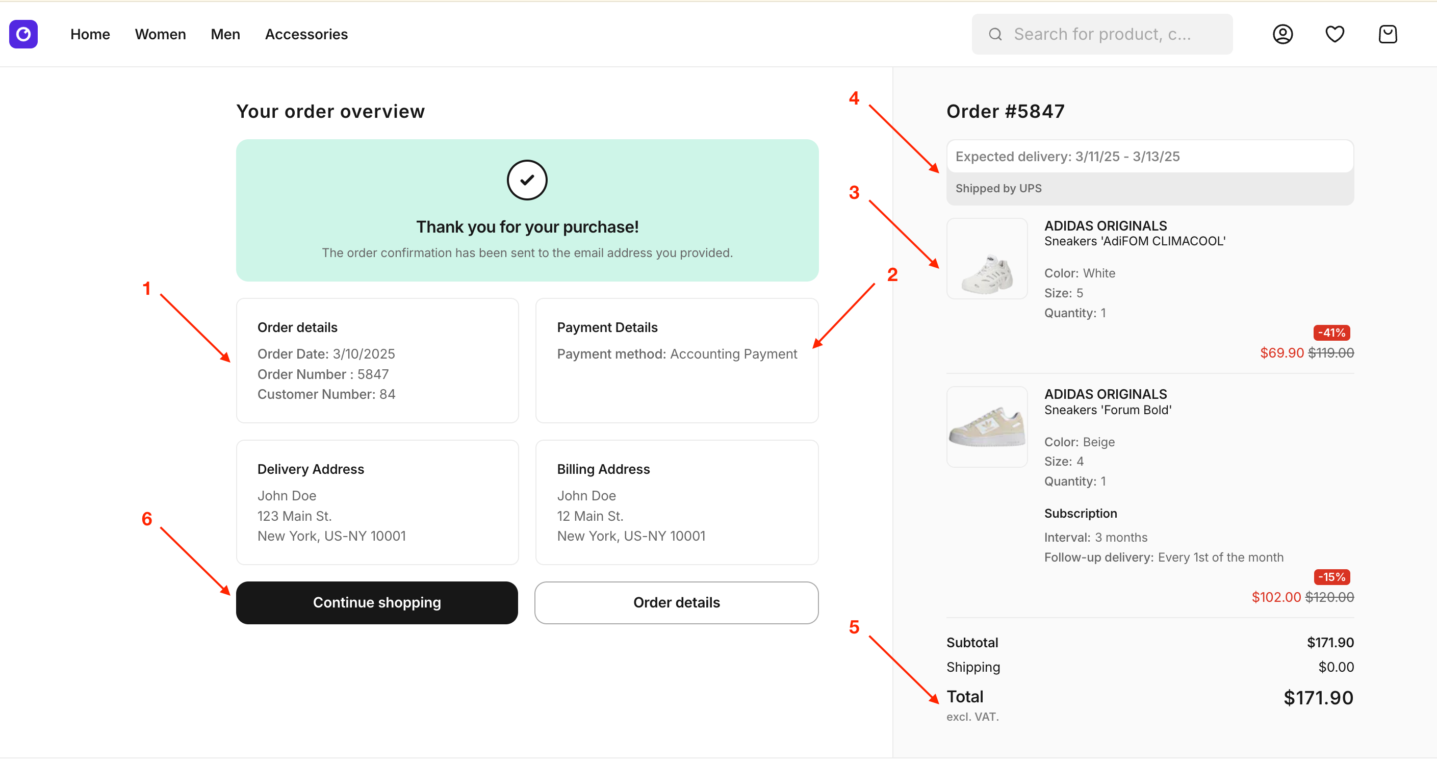 Shows a breakdown of costs, including subtotal, discounts, shipping, and taxes. - Call-to-Actions (CTAs)