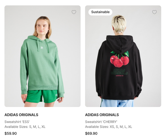 We only render this component if we have some availableVariants; this is handled by the v-if directive, which conditionally renders a component. We also give our component some styling for consistency with the application. To also have a bit of space between the product name and the available sizes, we can add the class mb-0.5 to the product name paragraph, which will give the component a small bottom margin. The final outcome of this customization is: