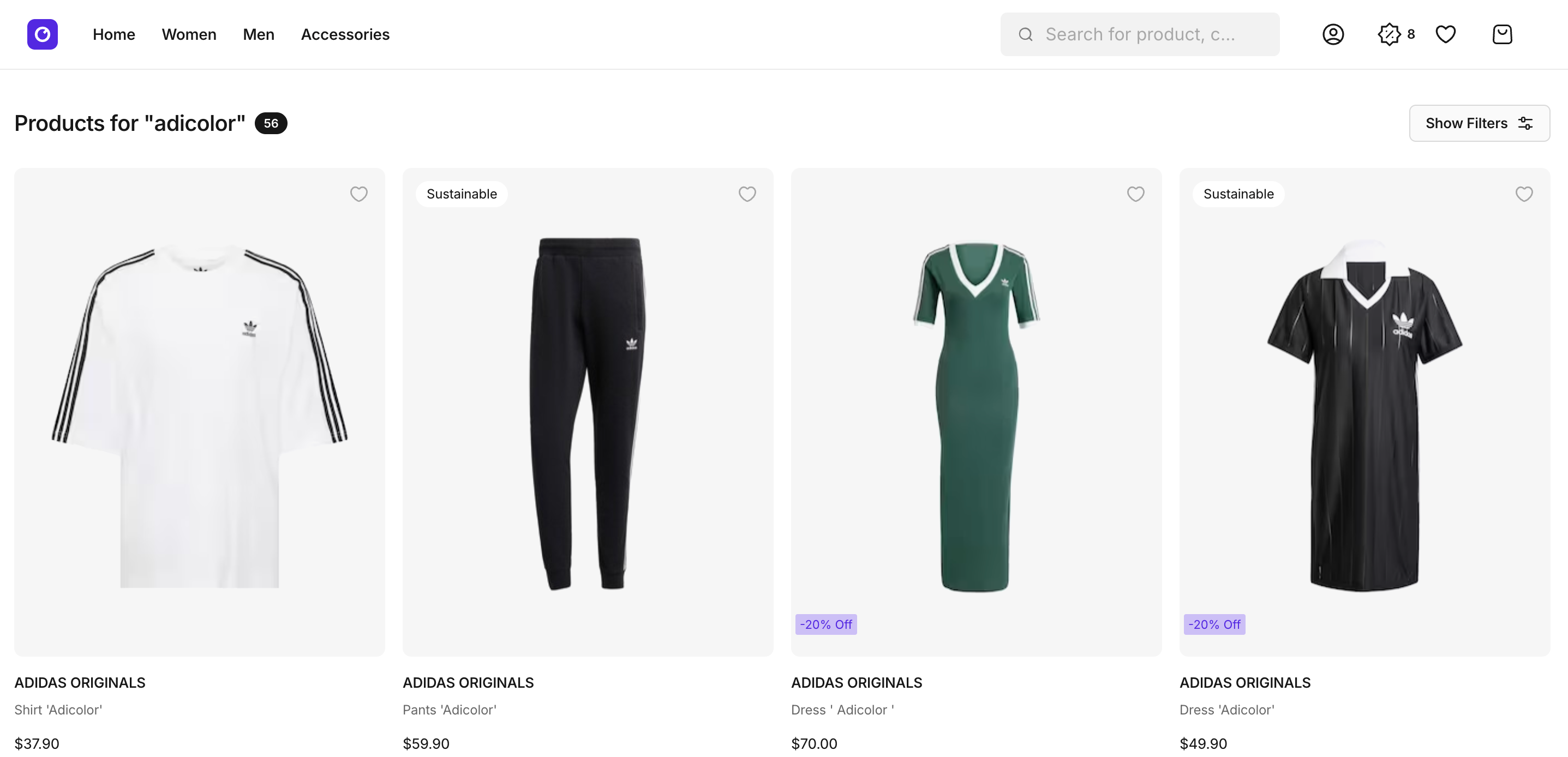 - If no exact match is found, a search result page is displayed, featuring a range of products related to the term.
