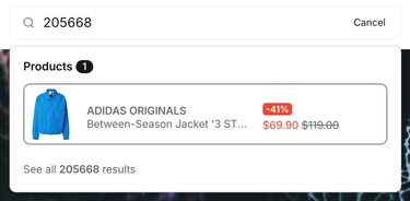- Product matches are displayed when a user enters a product ID or a term associated with the
