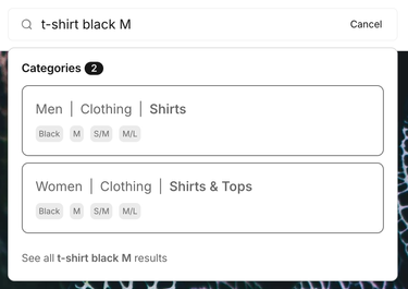 - If a shop category matches the search term, it is displayed along with relevant filterable attribute groups. For example, searching for "shirt black M" will direct users to the