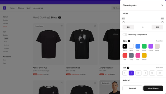 Shirtcategory. - Category (with filters) – e.g., typing "shirt black M" suggests the