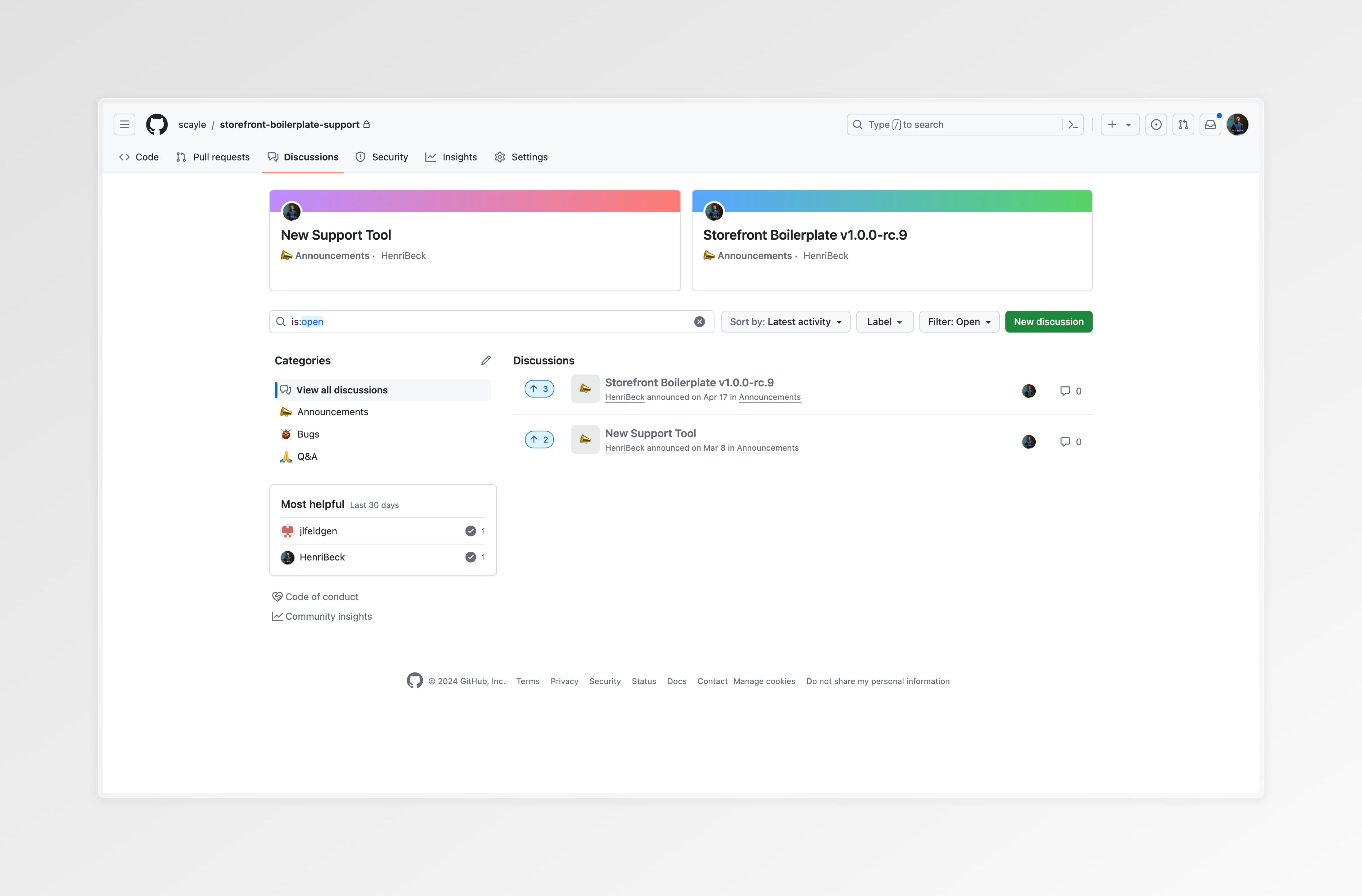 We use GitHub Discussions for release announcements, as a knowledge base, and as a way to foster a community among developers using the SCAYLE Storefront Application. This approach allows developers to resolve issues faster and launch shops sooner.