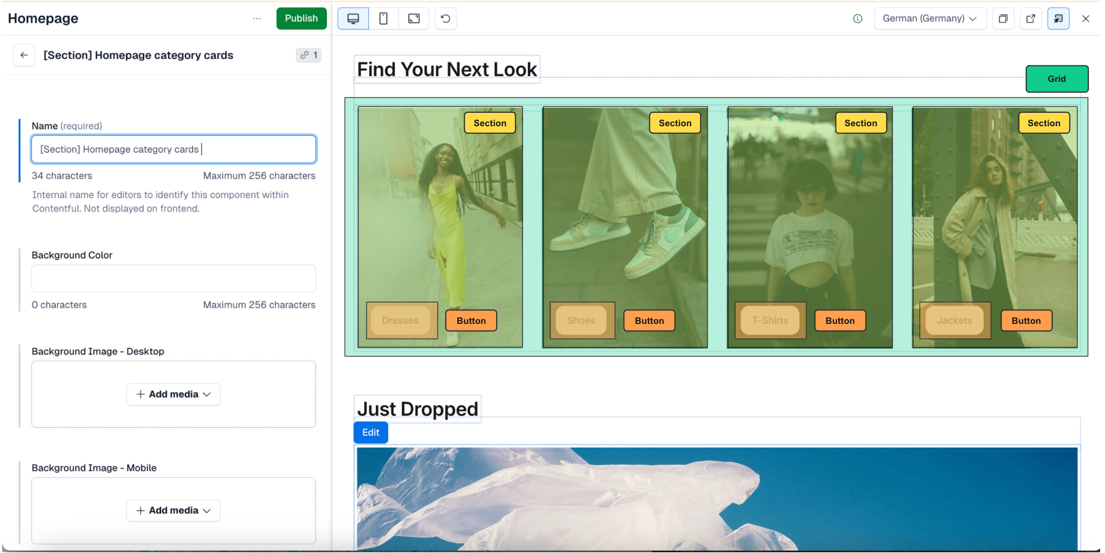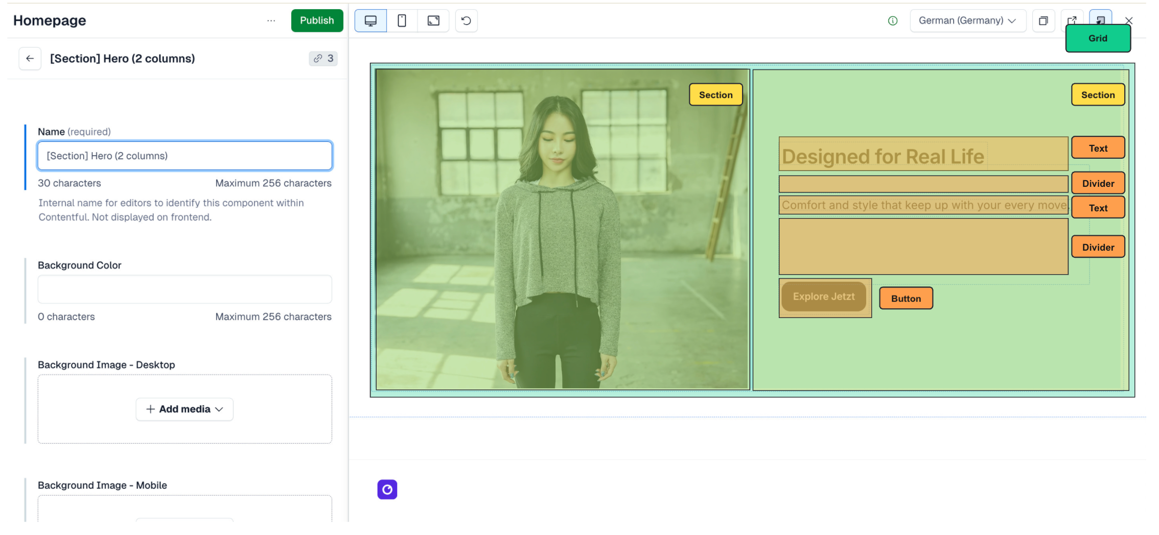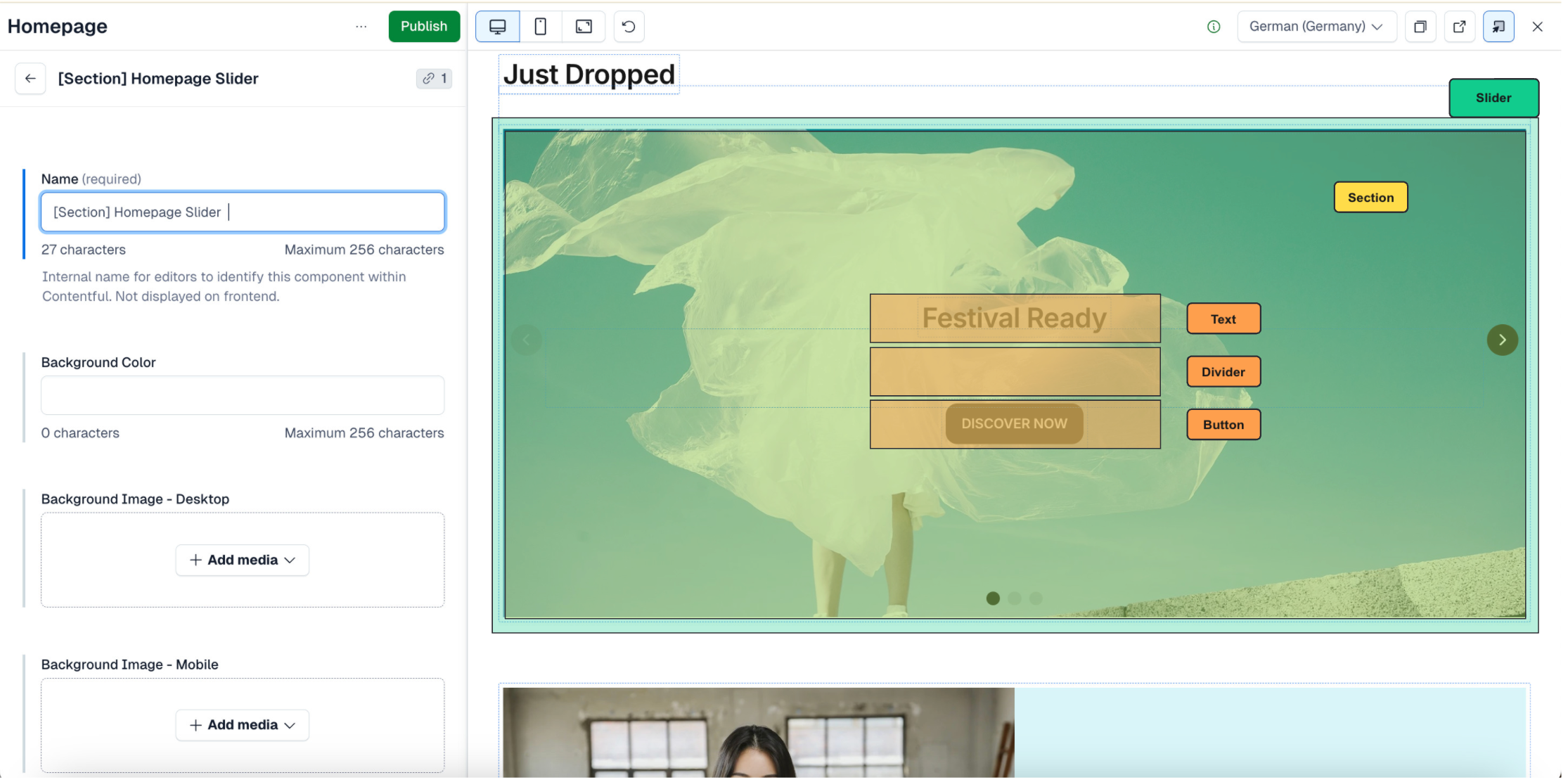 Contentful uses a content-type-based architecture where content is built from flexible, reusable content blocks. Each Contentful content type maps to a Vue component in your application, enabling a seamless bridge between your CMS and Storefront.