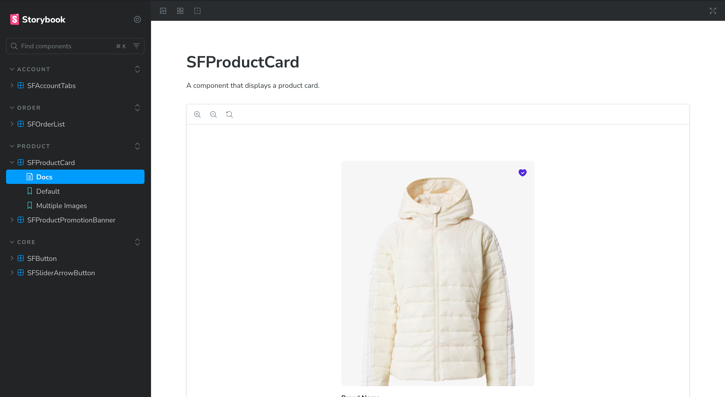 In this view, you’re seeing the documentation page for the SFProductCard component.