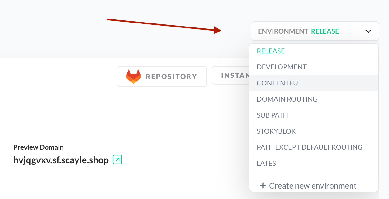 Environments are crucial to test different features and aspects of your Storefront Application. Use the "Environments" dropdown to check the list of currently available environments and create new ones. Keep in mind that as part of the initial Git repository setup, SCAYLE will always create one pre-defined environment for you. The value of the pre-generated environment key of that environment is main .