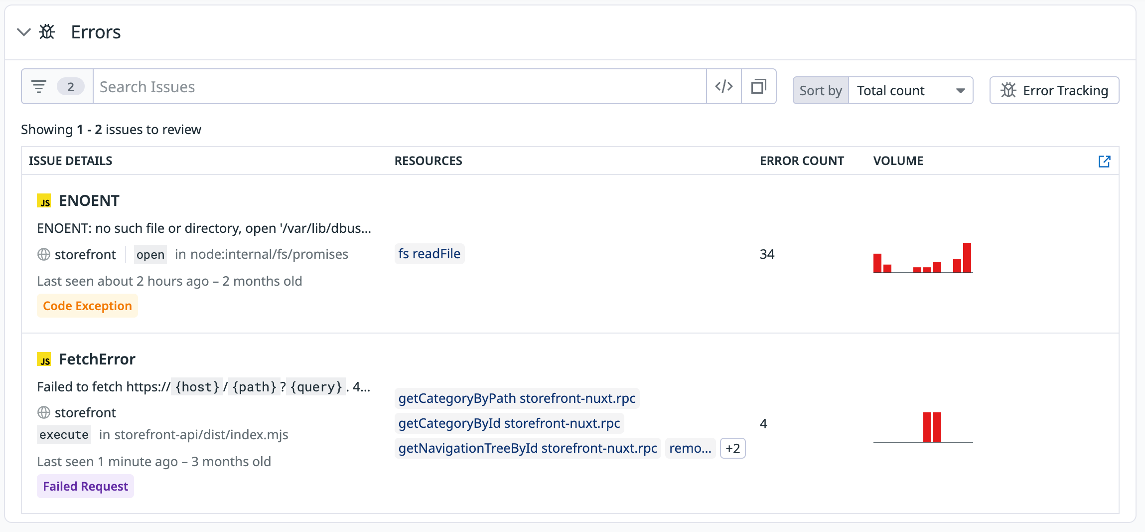storefrontservice page to see aggregated error data, allowing you to identify what is responsible for a spike in errors.