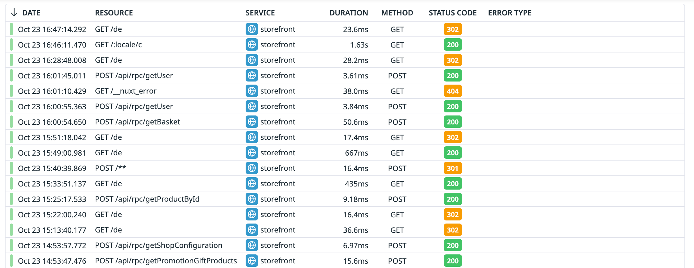 All performance metrics and traces for your Storefront application are shown within Datadog's APM section.