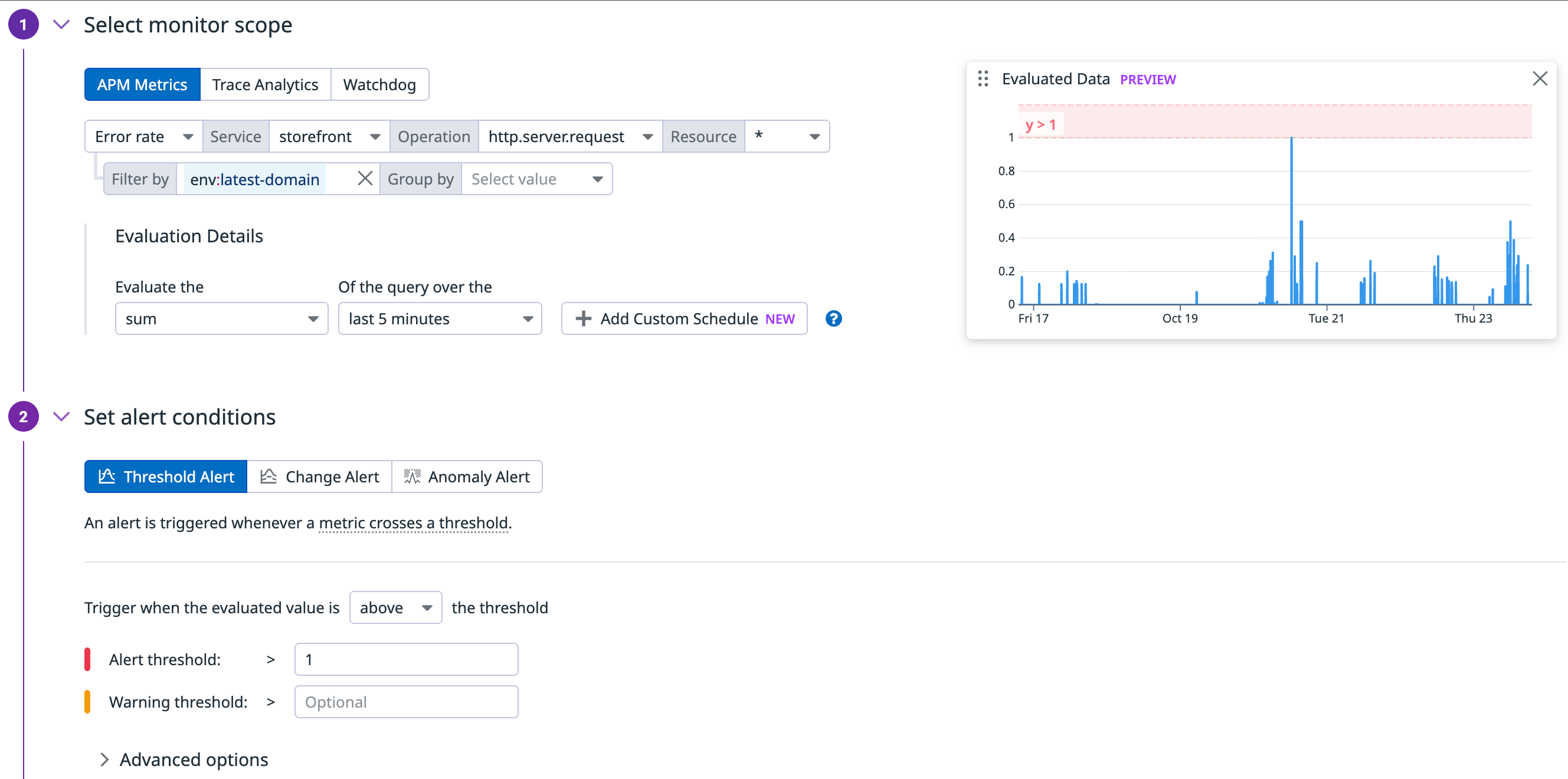 As an example, let's create a dedicated standard alert for "High Error Rate", which notifies you if the underlying API of your Storefront starts failing regularly, as maybe a sign of a deployment issue or a failure.