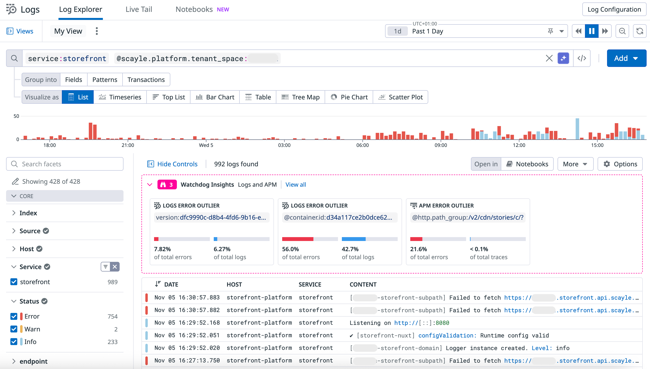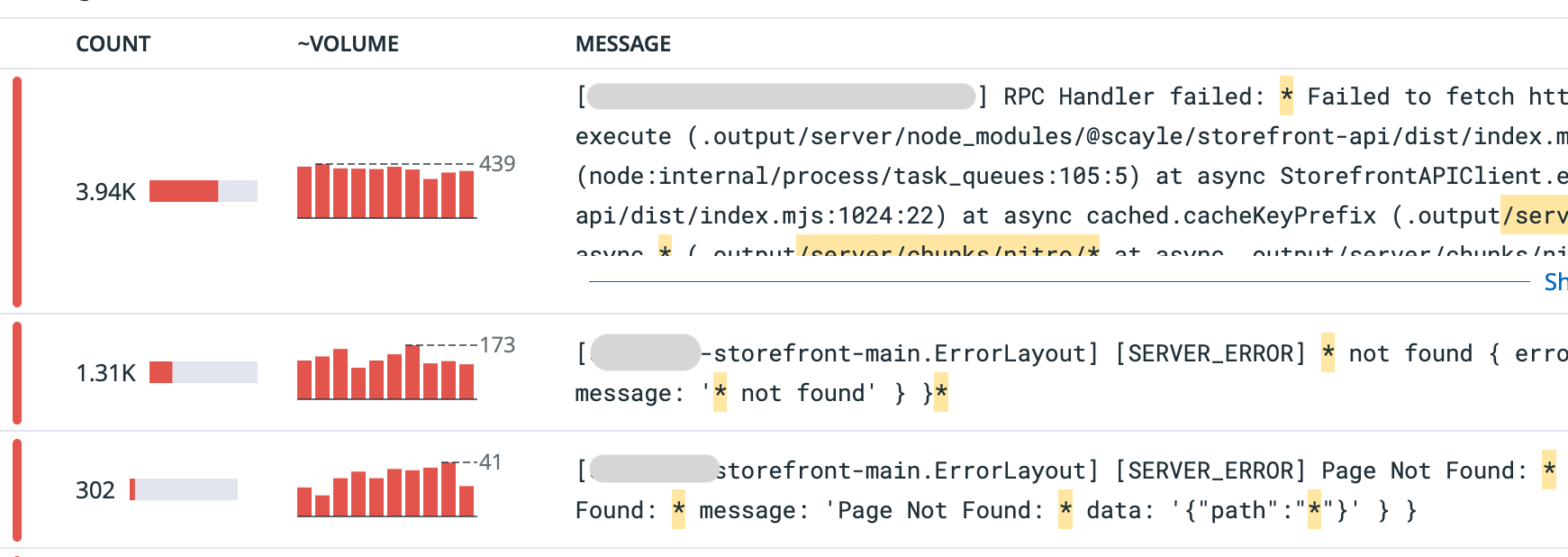 service:storefrontand optionally for the environment (e.g.@scayle.platform.tenant_space:{tenantSpace}) to ensure you view only the log activity generated by your hosted application for a specific environment.