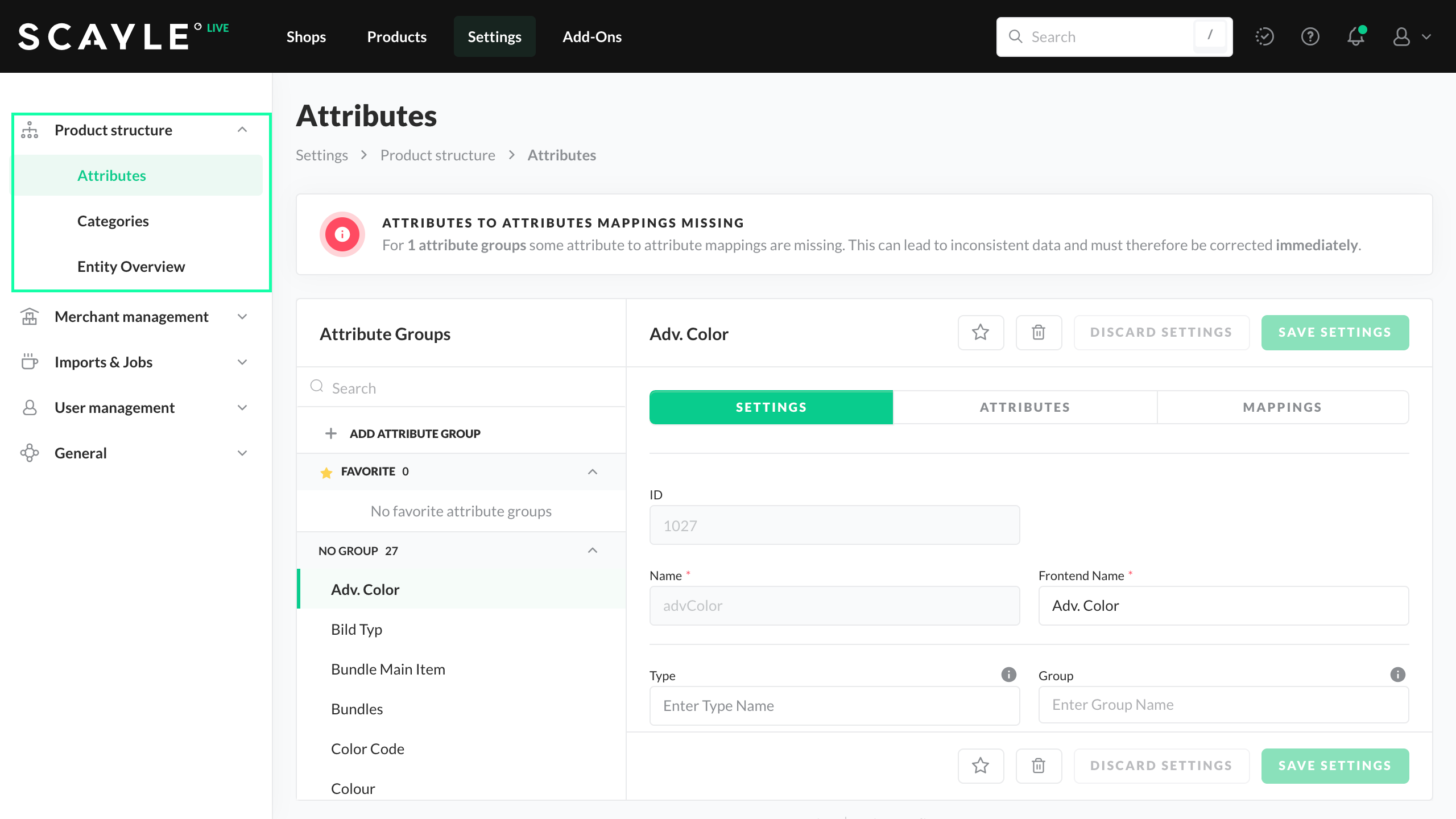 attributeGroupName to be specified, e.g., {"type": "attributeGroup", "attributeGroupName": "unit"}attributeGroupName and attributeName to be specified, e.g., {"type": "attributeGroup", "attributeGroupName": "unit", "attributeName": "cm"}When creating an Attribute Group within the SCAYLE Panel, you can choose between Simple and Advanced attribute structures.