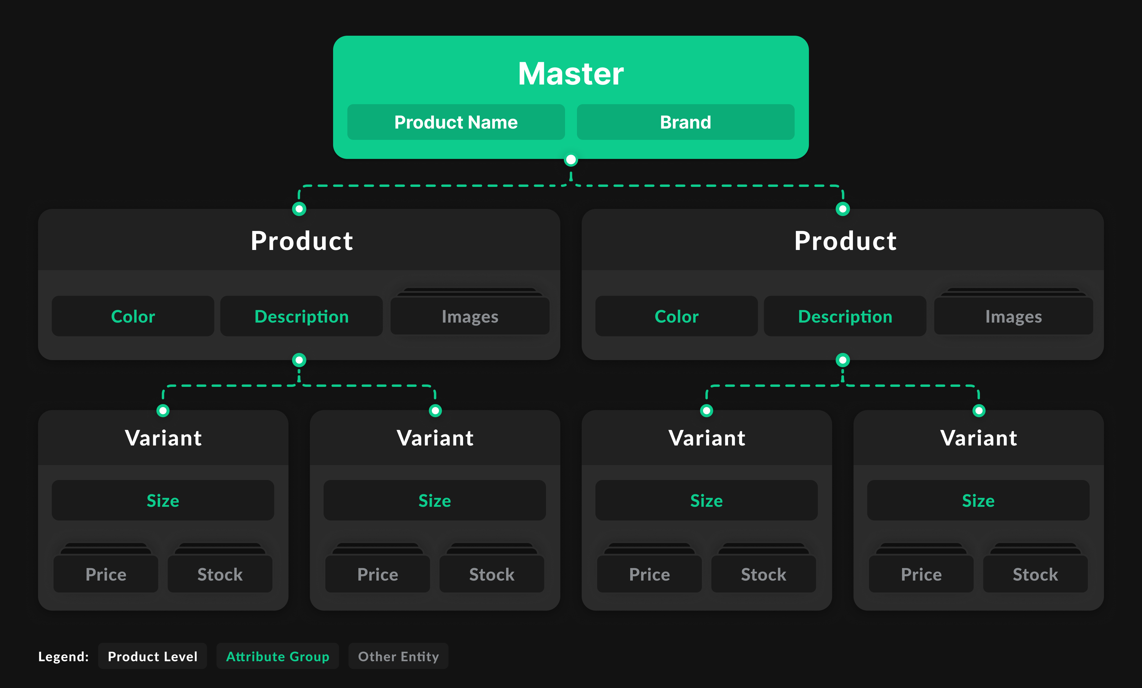 Information about products is stored as Attribute Groups. Product data can be configured and customized at different entity levels. The system differentiates between three entity levels: master, product, and variant.
