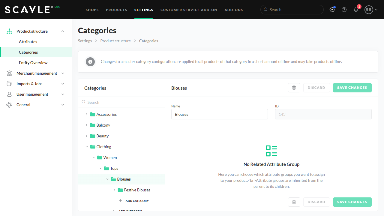 All already created master categories can be found in SCAYLE under Settings ➜ Product Structure ➜ Categories. Here you can also manage categories and create new ones.