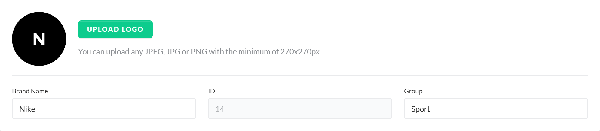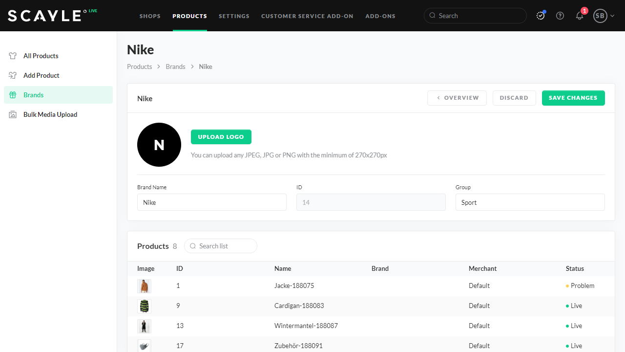 You can see all brand information on the corresponding details page, add or change a logo, customize the name, add a brand group, and view the brand ID. Furthermore, you can adjust brand-specific Attribute Groups (for example, sustainability).