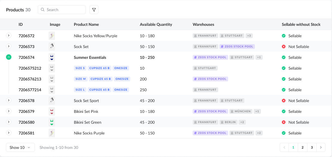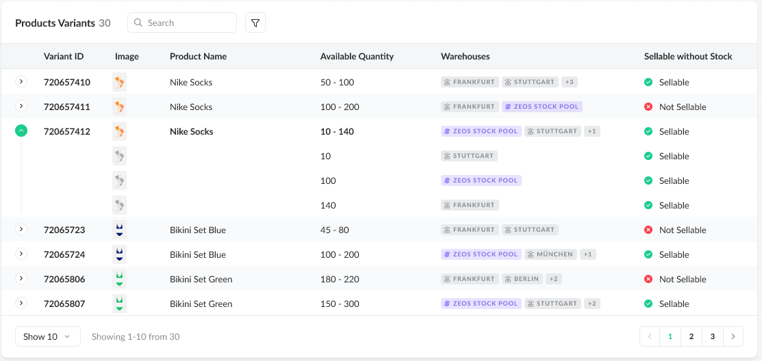 Users can search by product name or ID and refine results by warehouse or sellable status. For each variant, the system shows the available quantity, the specific warehouses it is stored in, and whether it is sellable without stock. Visibility is restricted to variants from merchants the user is authorized to access.
