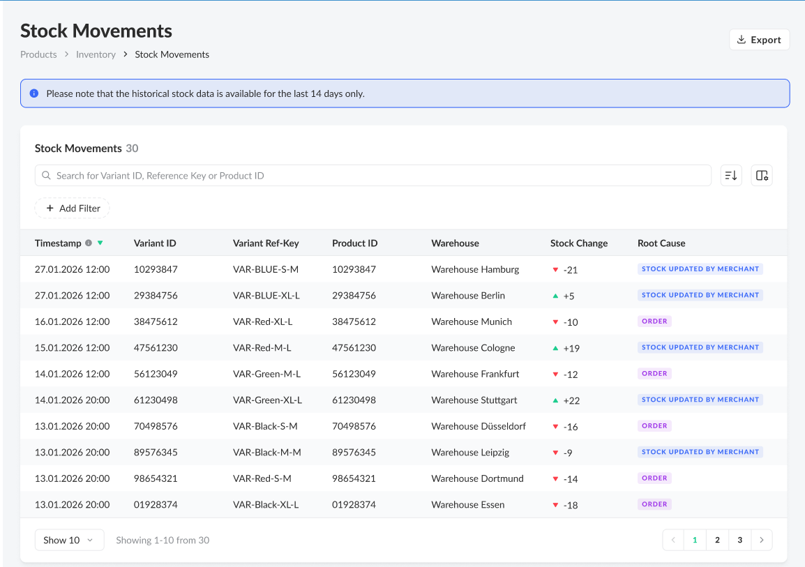 Note on Data Retention: Stock movement records are stored for 14 days. If a variant has its first update within this window and no previous record exists for comparison, the stock change will be displayed as a dash “—”. A tooltip will inform the user that no baseline data is available within the retention period to calculate a delta.