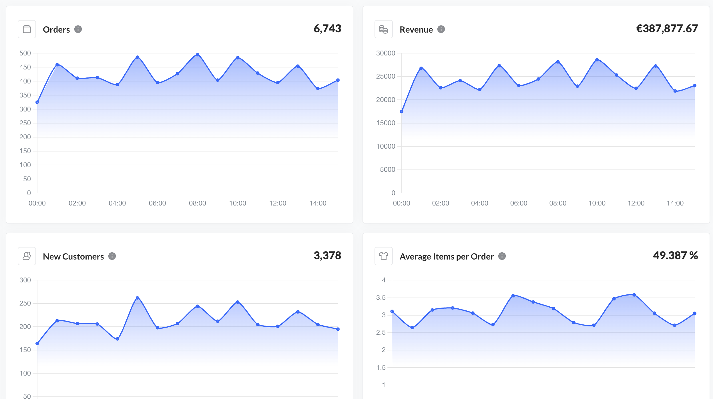 | Revenue | ✓ | ✓ | Total revenue (Prices including taxes) by confirmed orders for the given time frame (global-shop always shows the revenue in the currency that is assigned to the default locale an environment is set up with even if one of the countries has a different currency). |