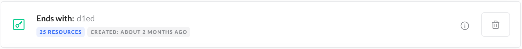 API keys can be removed individually using the delete icon. The permission api_key__delete is required for this action. Deleting an API key will immediately disable all access utilizing that key.