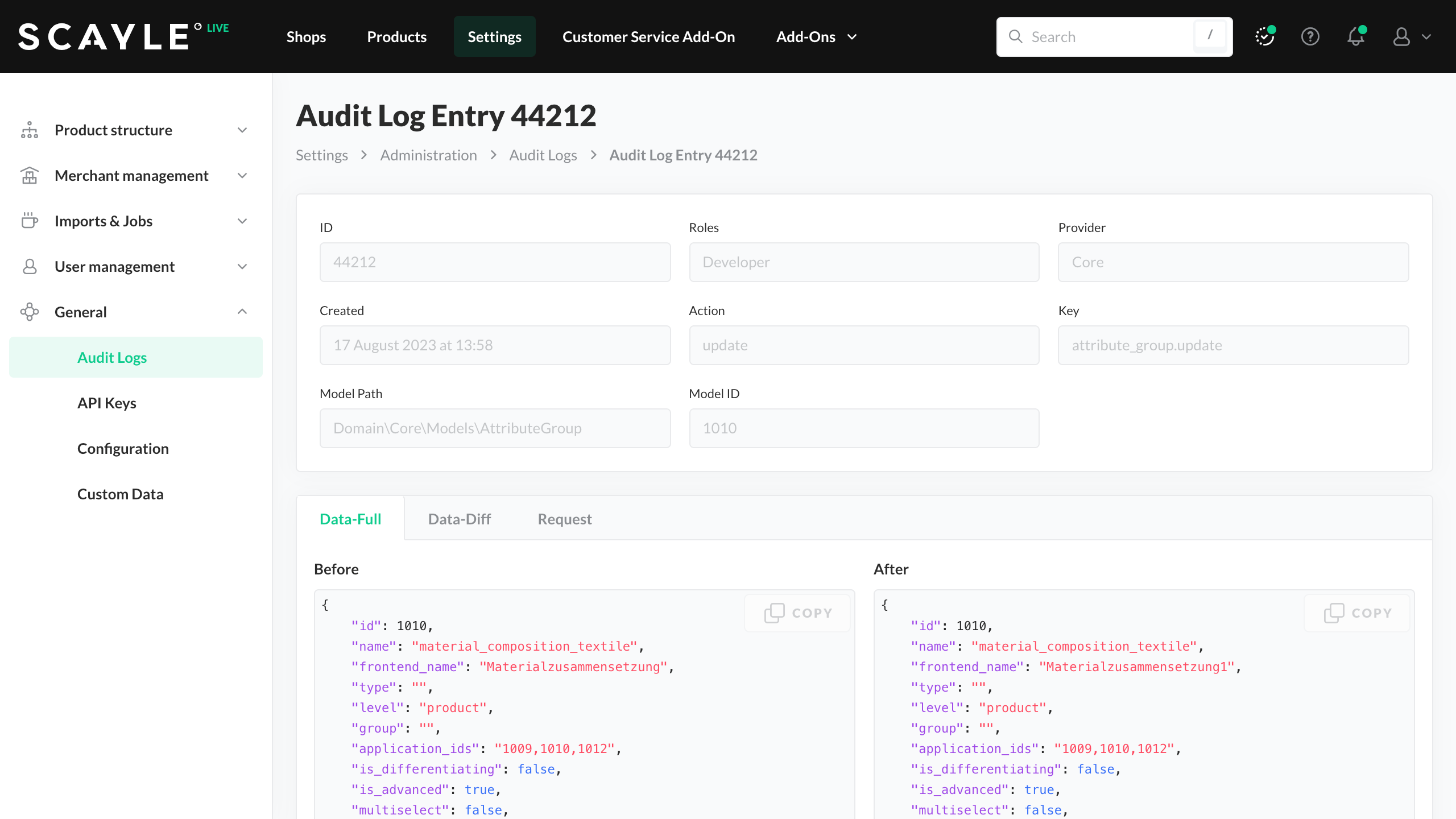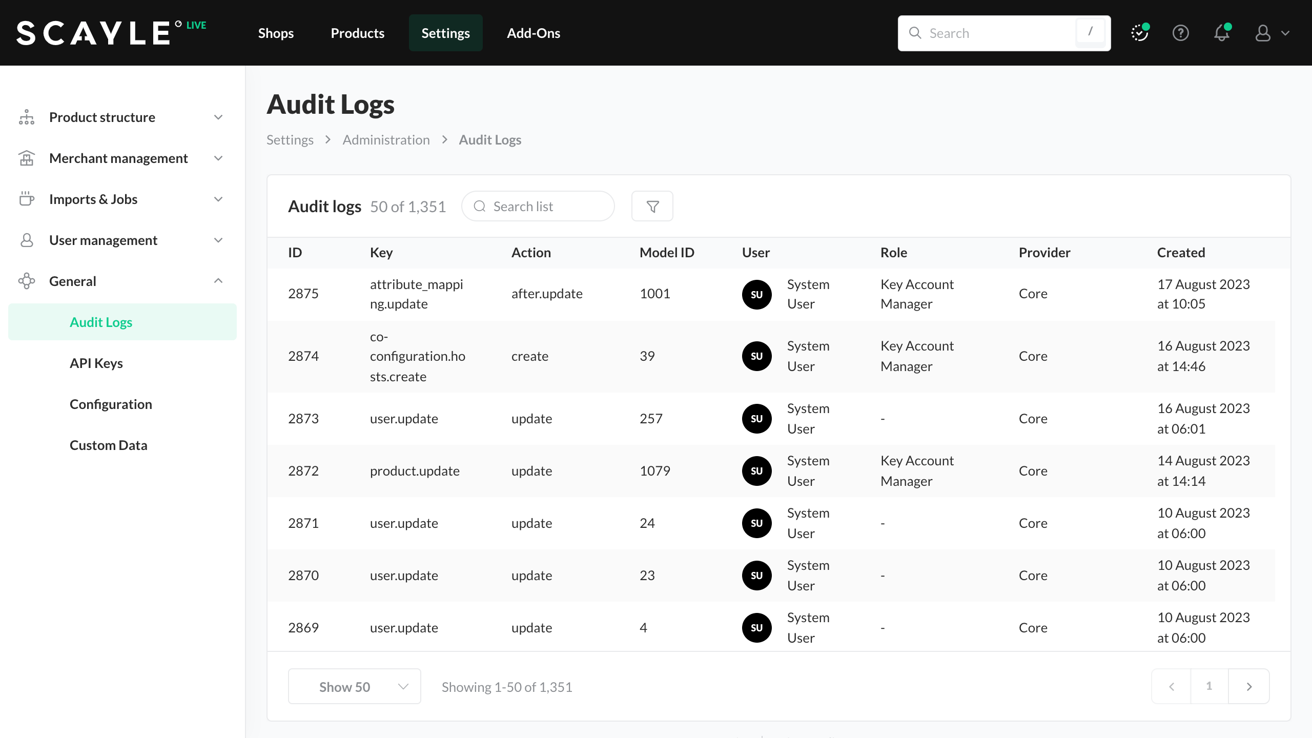 All actions that take place in your SCAYLE Panel are logged and can be viewed on the Audit Logs page.