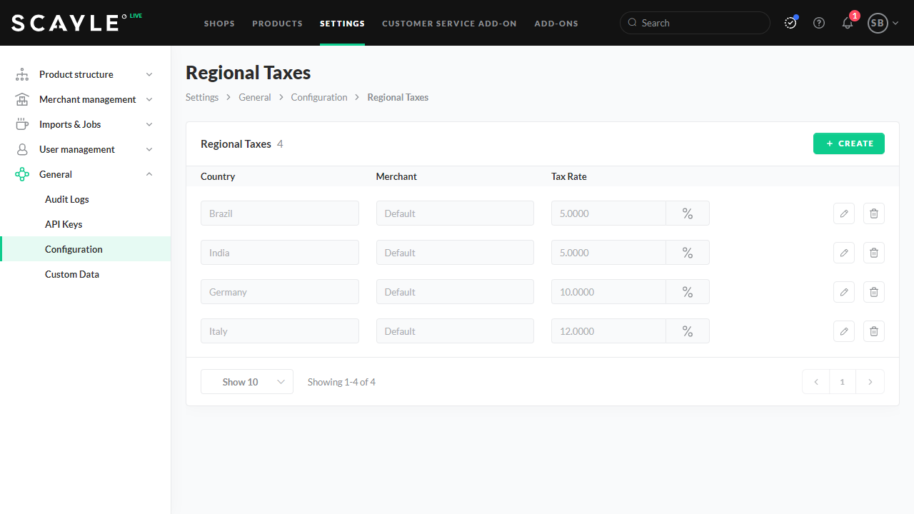 Click on the pen icon to the right of an entry to edit the data set or on the trash bin icon to remove an entry. You can create several entries for each merchant in different regions with the respective tax rate.