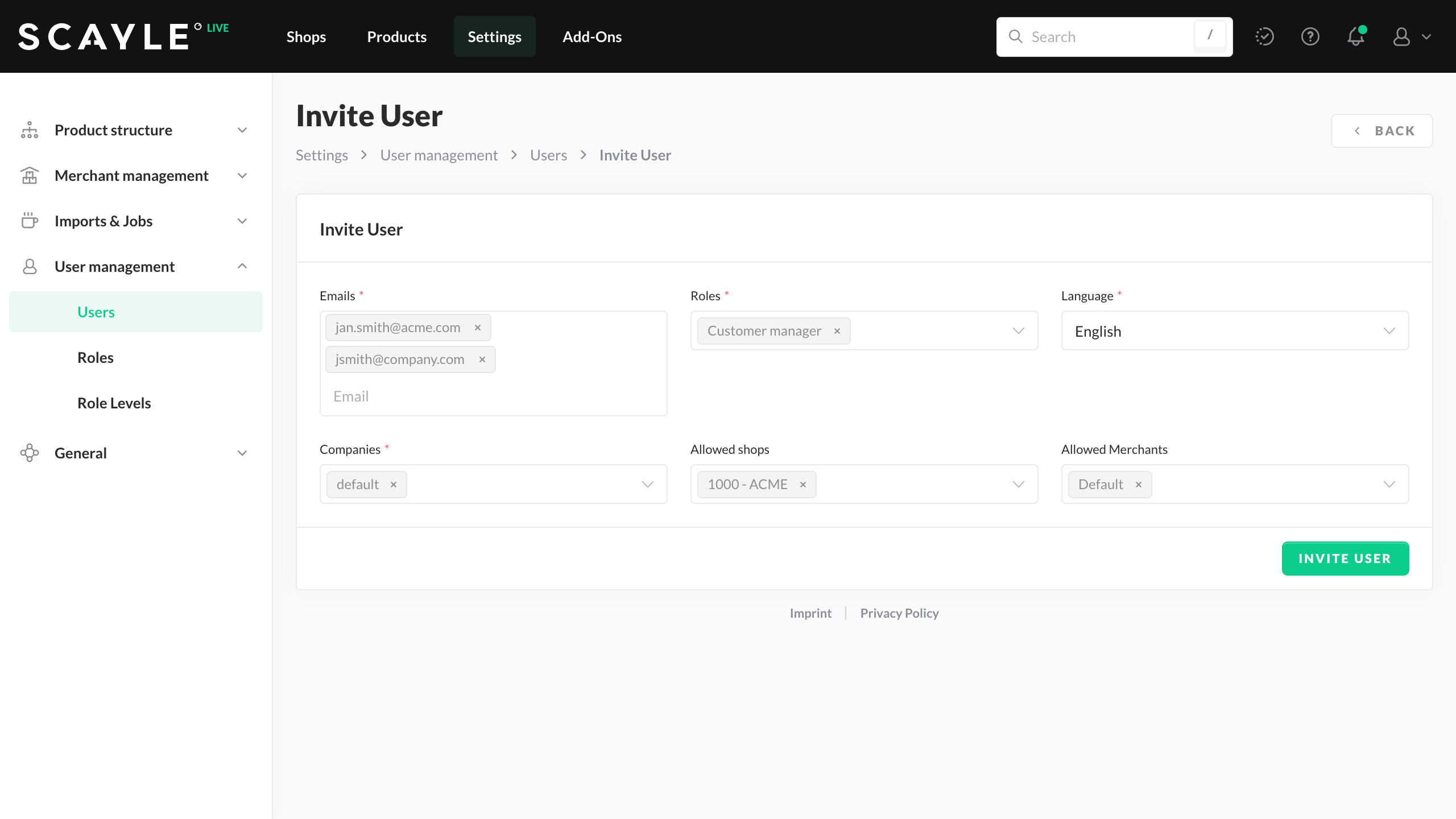 - Specify the new user's Emails, Roles, Language, Companies, and, if required, Allowed Shops, Allowed Shop Countries and Allowed Merchants.