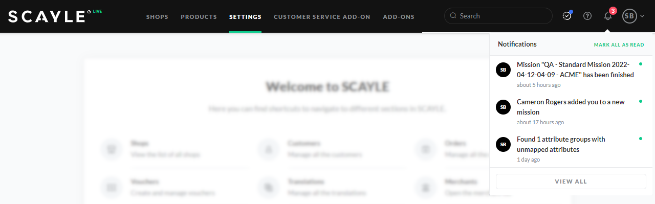 Notifications are updates about various actions in SCAYLE. You can manage your preferences in the notification settings, which you can access either on your user profile or by clicking the bell icon (next to the user icon in the right top corner).