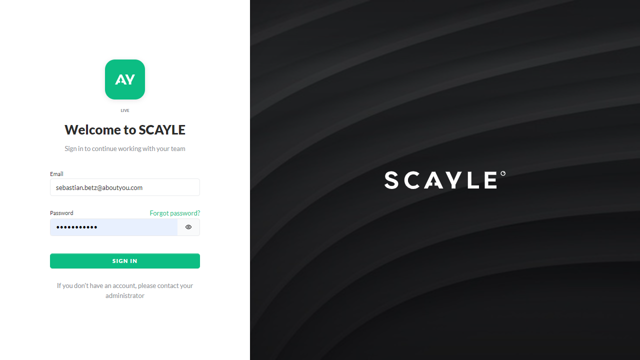 For the first sign-in, administrators are sent a user account for the SCAYLE Panel. Administrators can then invite new users with the appropriate roles. To create a new account, you only need the user's email address. Users set their own password when signing in for the first time.