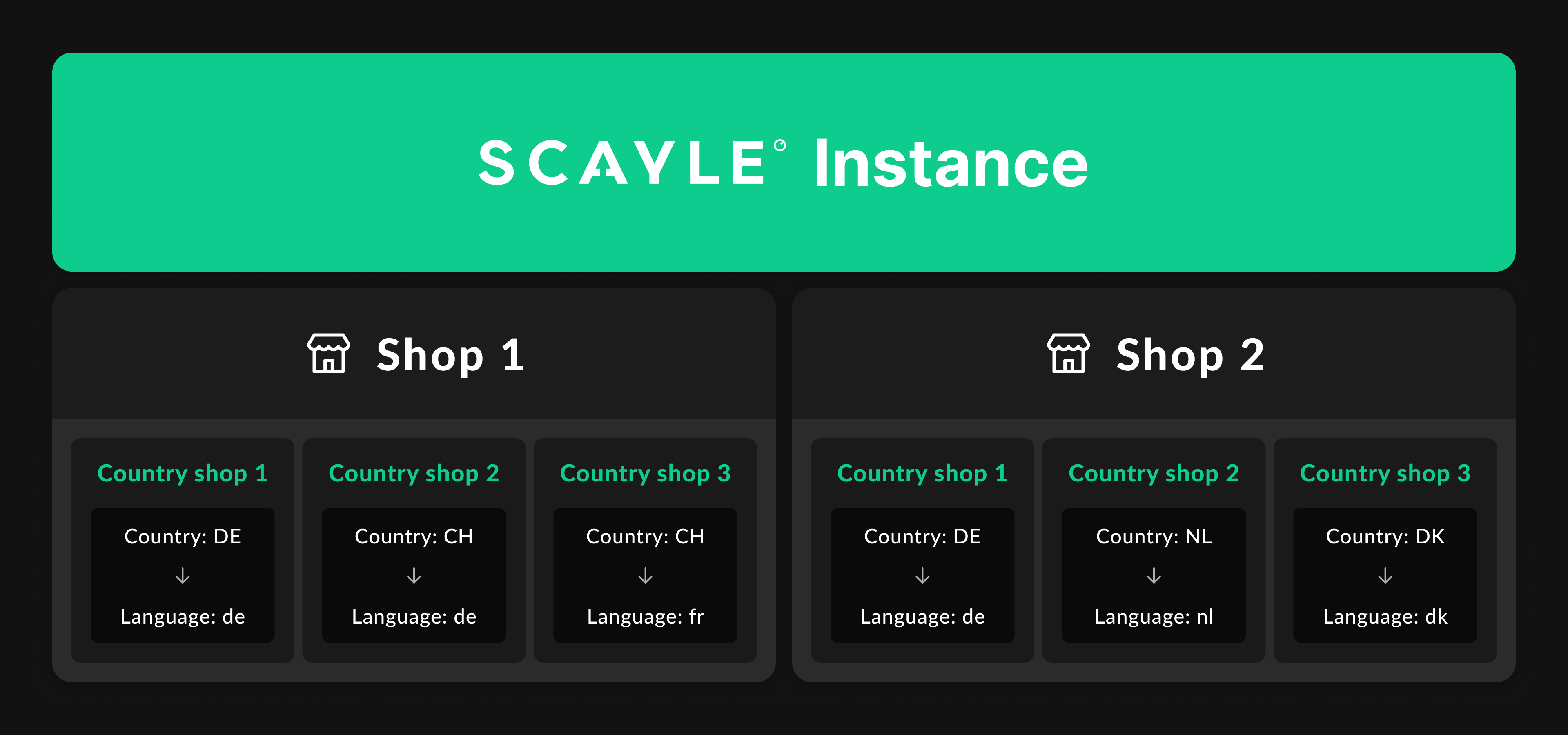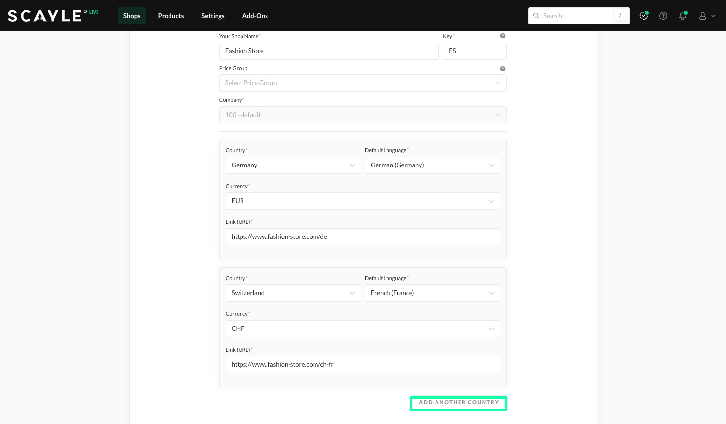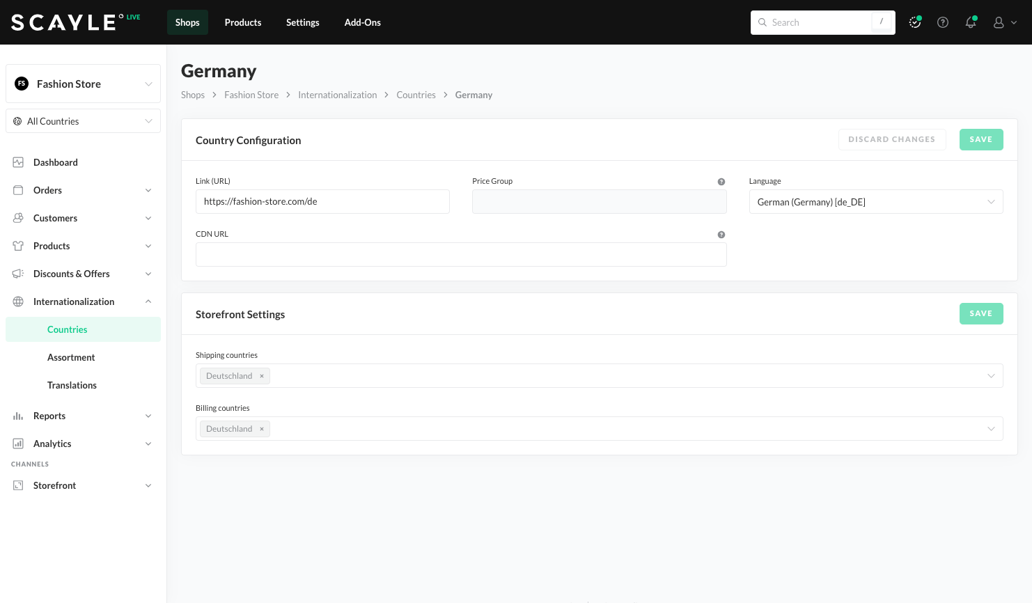 You can use the SCAYLE Panel to set up shops and shop countries. While you can also configure a shop using the Admin API, we recommend doing this only once during setup, making the SCAYLE Panel a more convenient option. Learn more here.