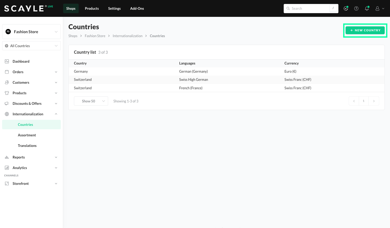 For our example Fashion Store, we need to set up shop countries in Germany and Switzerland. Switzerland serves German and French-speaking customers, so we’ll create two shop countries for Switzerland. We’ll use EUR in the German shop country, and CHF in the Swiss shop countries.