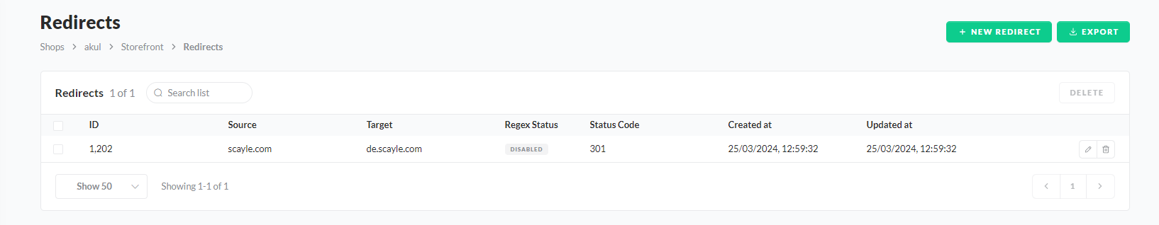 - Go to Shops ➜ [Shop] ➜ Storefront ➜ Redirects.