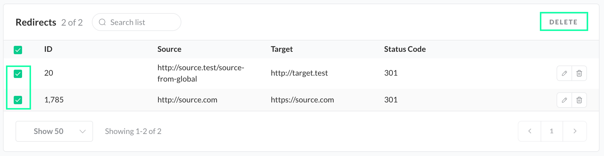 - Use the checkboxes to select the redirects you want to delete and click Delete.