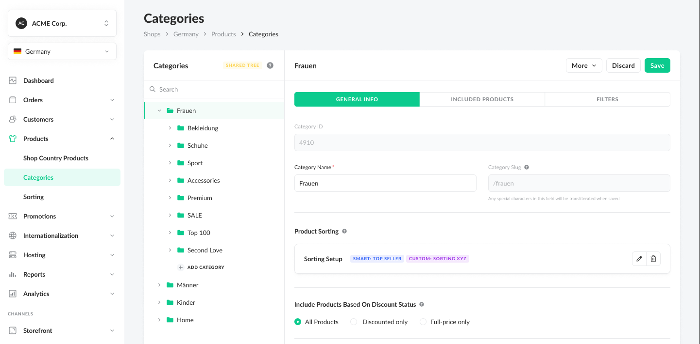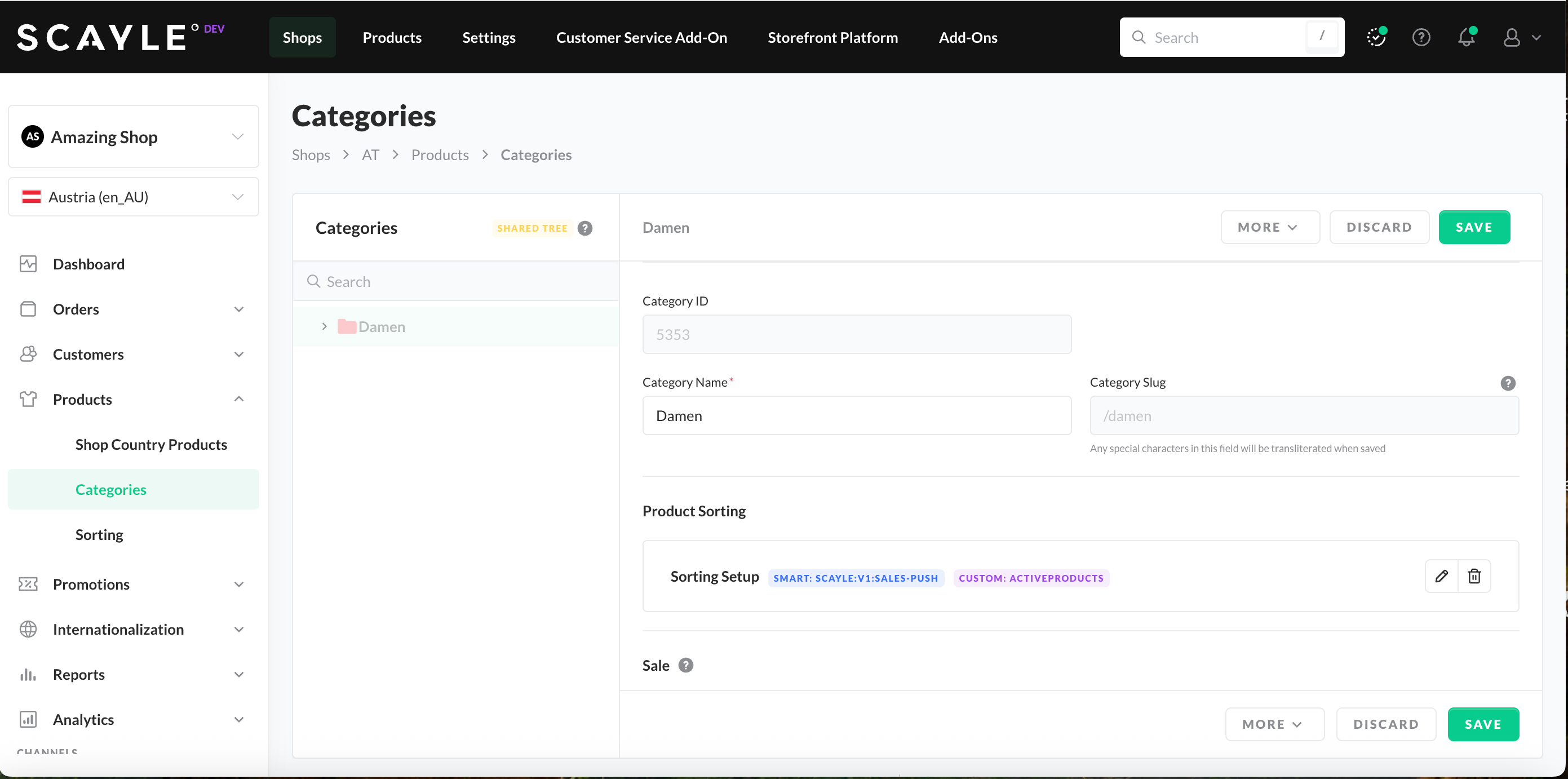 You can apply a specific sorting logic to a shop category on local shop level. Whether or not a smart sorting was already applied on global shop or shop country level (refer here for for more information of how to apply a smart sorting on shop level) you can define a shop country category specific sorting here that will override configurations stored at (local) shop level.
