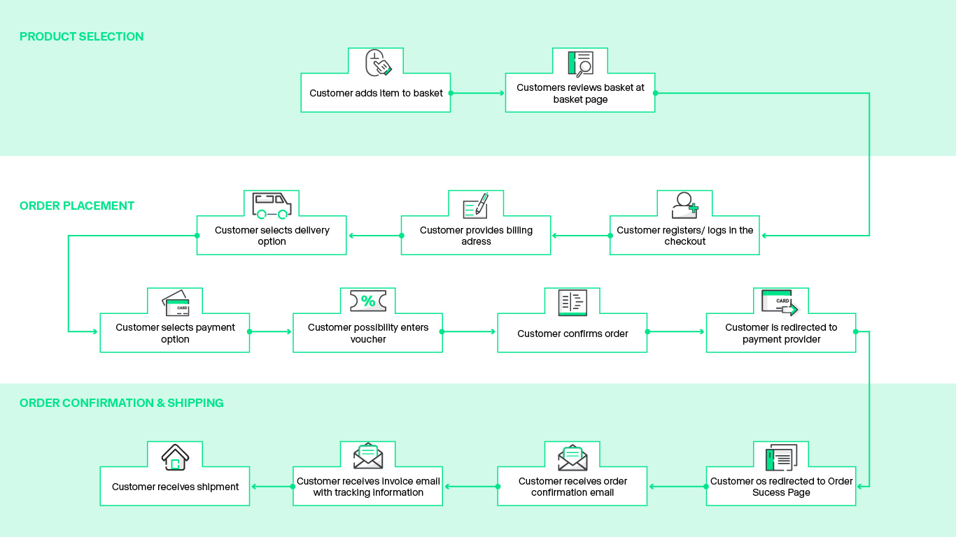 Once a customer has reached the checkout, he or she must either create a new account or log in. Afterward, the customer can specify the shipping address and place of delivery, and select a payment method. After that, all order items are reserved temporarily. The customer can now enter a voucher and check if the order is correct and complete. As soon as the customer confirms that all information entered is correct, the order is sent and the customer is redirected to an external page to complete the payment.