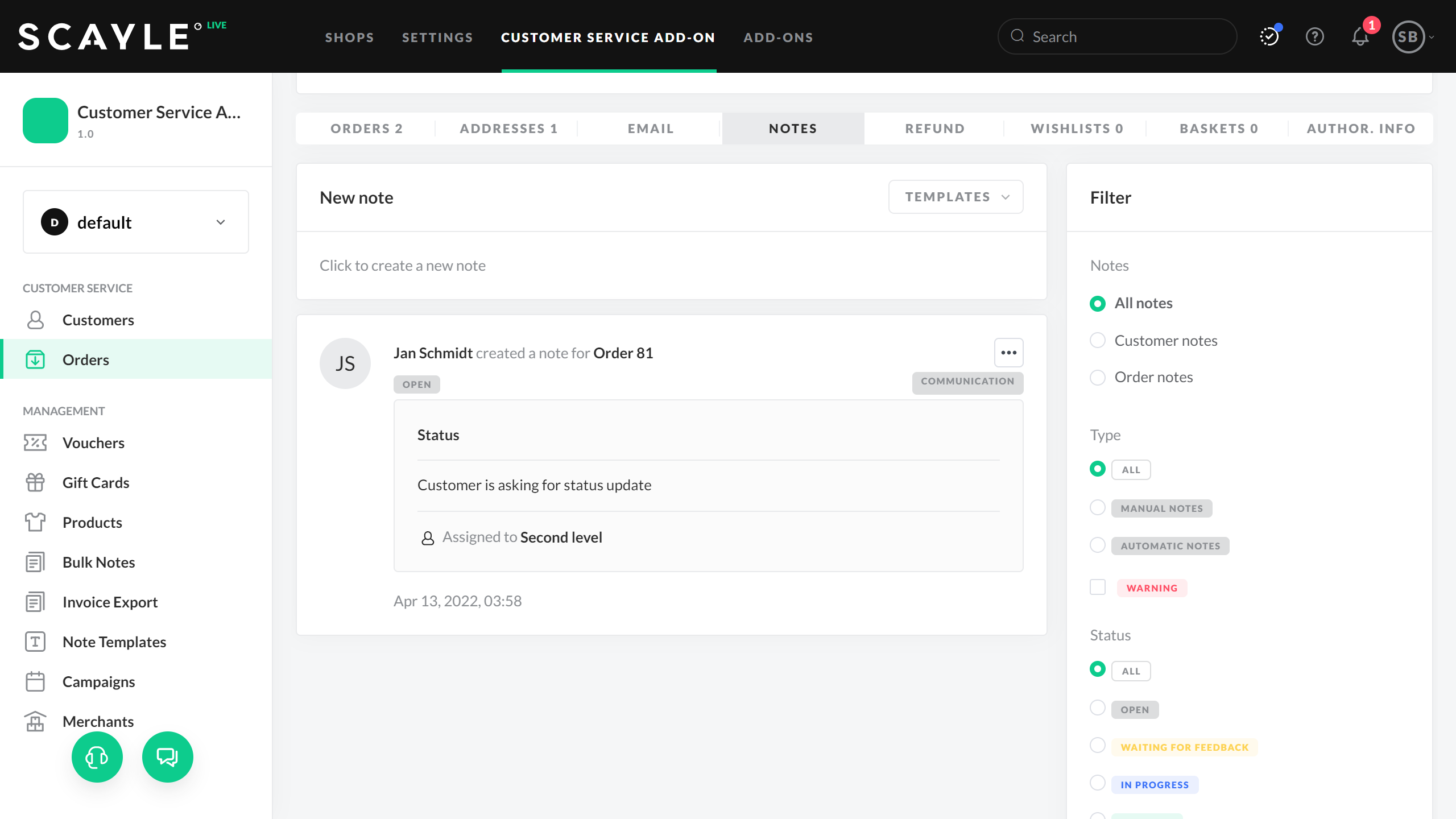 - Notes: within the current order, all notes, customer notes, or order notes