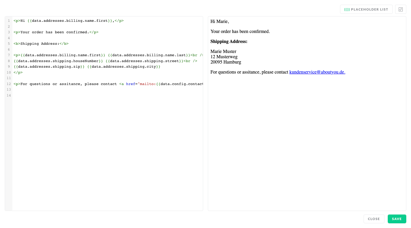 Placeholders are added to the body using mustache syntax. For example, for a personal greeting, the billing first name could be added with {{data.addresses.billing.name.first}}. You can view and copy the placeholders by clicking the Placeholder List button right above the document body editor provides a comprehensive list.