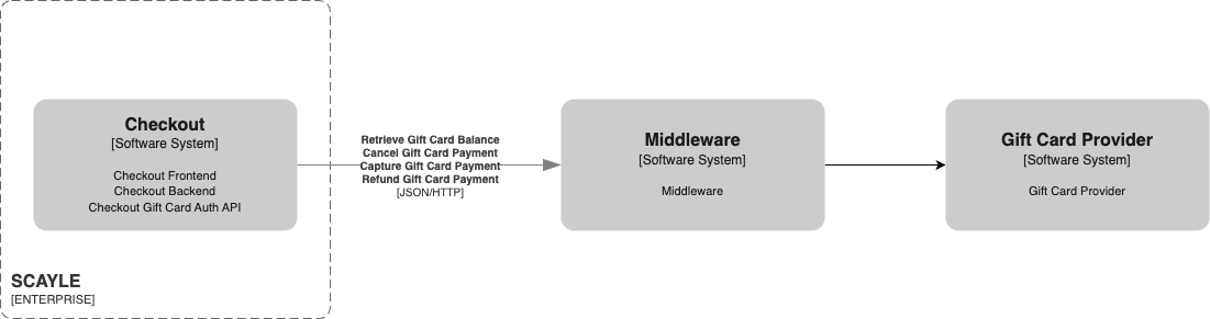 A middleware sits between SCAYLE’s Checkout Gift Card API and the gift card provider(s) to map the requests from Checkout to the format of the third-party system(s) used by a tenant. In the case of multiple providers, the middleware is used as a gateway.
