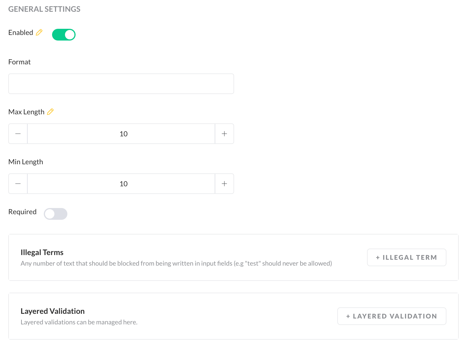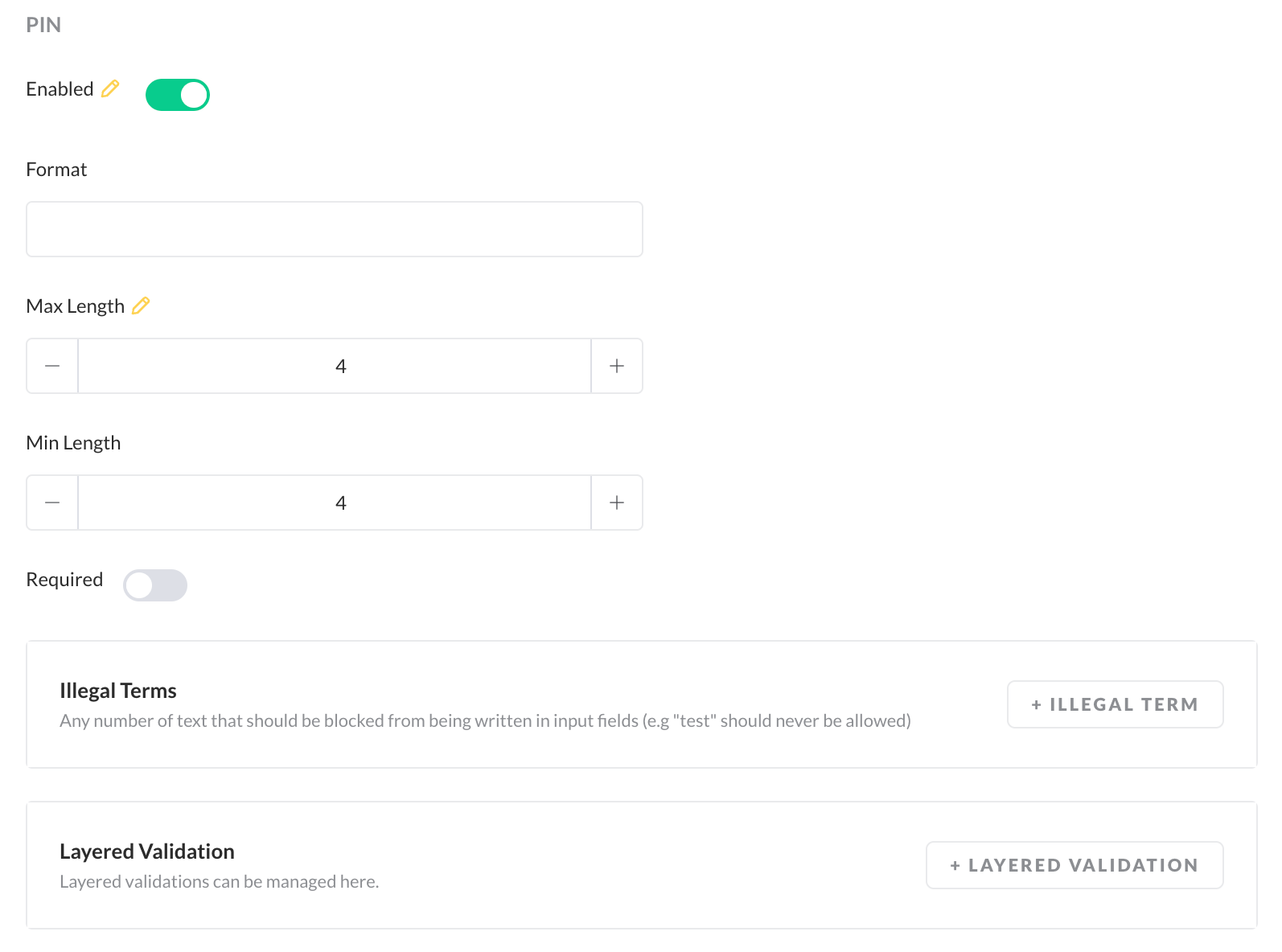 - Format - allows to define a regex for the frontend validation of pins,